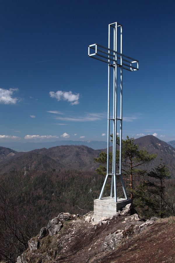 Príjemné klesanie ma dovedie do sedla pod Ostrým. Na vrchol je to len krátka zachádzka, zato však výživná. Aj tu sú posledné metre po šmykľavej skale zaistené reťazou. Ostré (1067m) má na počudovanie plochý a dosť zarastený vrchol, avšak po krajoch sú viaceré pekné skalné vyhliadky. Určite ho netreba obchádzať. Schádzam reťazami naspäť. Pod najstrmším úsekom je odbočka k Švošovskej vyhliadke. Mäkkučký chodník ma jemným klesaním pomedzi skalné bralá dovedie k 12-metrovému krížu. Ešte vonia novotou, nemá ani pol roka. (Vraj cca 300 metrov od kríža je na stromoch vo výške 7 metrov vyhliadková plošina pre turistov, no to zisťujem až po mojom návrate z túry.)