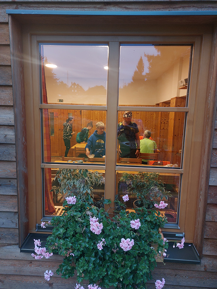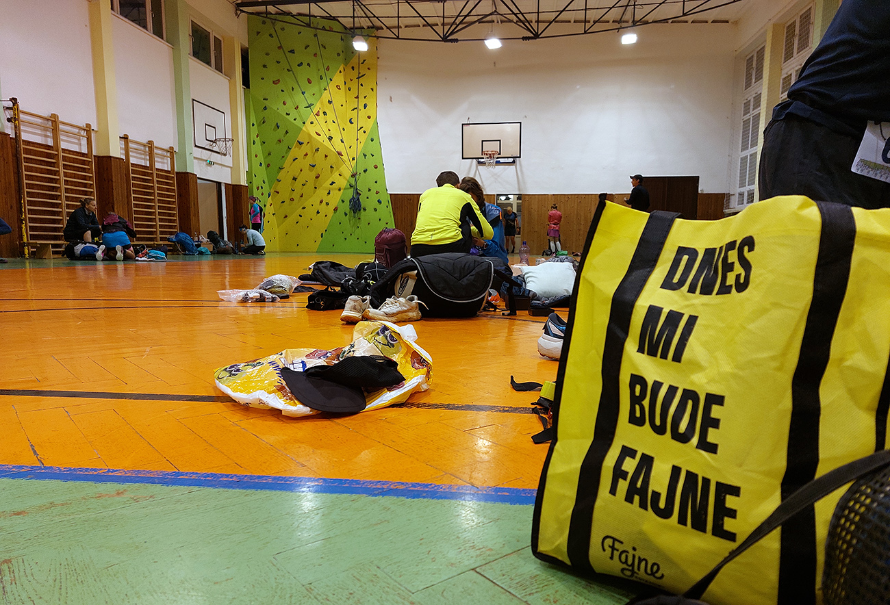 Telocvičná nocľaháreň vraj bola vybukovaná, ale nezdala sa nejako moc preplnená. Ktovie aké percento z vyše 220-hlavého stáda prihlásených ju využilo - myslím, že menšie ako polovičné. Zato niekto tam v noci vraj poriadne „drevo pílil“ a akustika je tam super, tak sa niektorí vraj moc nevyspali. Ale žiadne okno neprasklo od tých vibrácií, tak vlastne pohodka, na noci pred štartom už predsa nezáleží. Osobne som zľahol radšej na chodbu, aby som nerušil noc tuberáckym kašľom, ale na mňa sa nesťažoval nikto (ani chodba nebola prázdna). Lebo čo môže byť lepšia liečba na zápal priedušiek, ako prechádzka lesom na čerstvom vzduchu? Na účinky tej oxygenoterapie som celkom zvedavý.