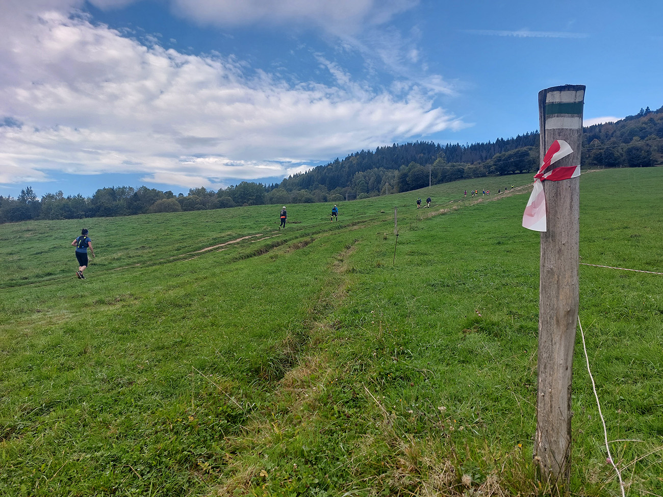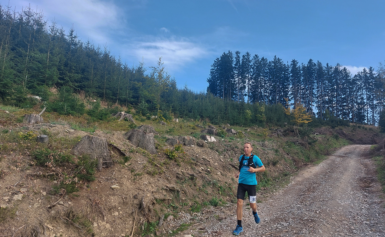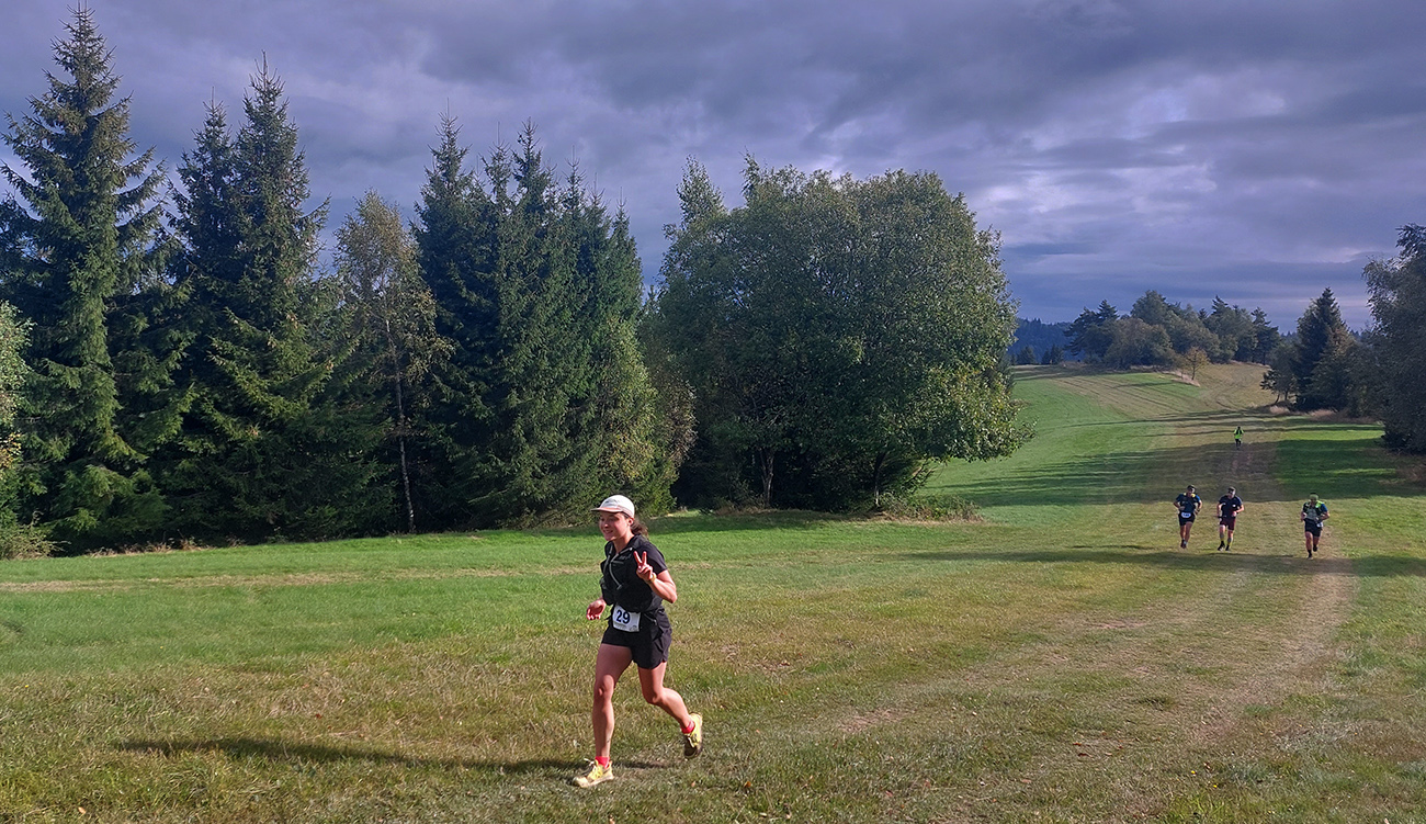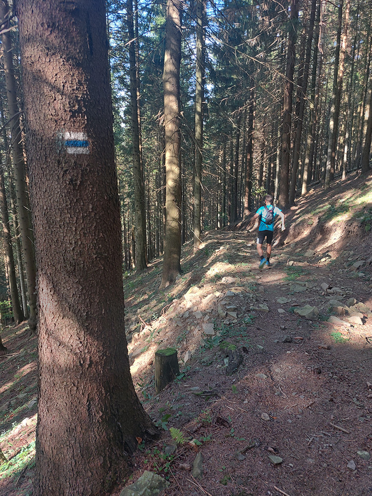 Úvodné kilometre sú tu v znamení dlhých výbehov aj zbehov, na jednu aj druhú stranu hrebeňa Javorníkov. Tak si hádam každý vychutnal v bočných dolinách a na svahoch tie rúbaniská a nové výhľady – a pod nohami v tých najstrmších sklonoch šutroviská. Ale jasné, že viac bolo pekných miest – pobehov po hrebeňoch a prebehov cez osady. Každý ešte plný síl, tempo závratné aj ďaleko za čelom. Len dve provokatérky si medzi tými prepaľovačmi vykluskávali, nabúravajúc ego spolubežiacim chlapom vykecávaním o tom, ako sa bežalo pred týždňom na maratóne v Košiciach za 2:51 :-) A že teda maratónsky osobáčik je najlepšie vyklusať stovkou... No hoďte na ne sieť!