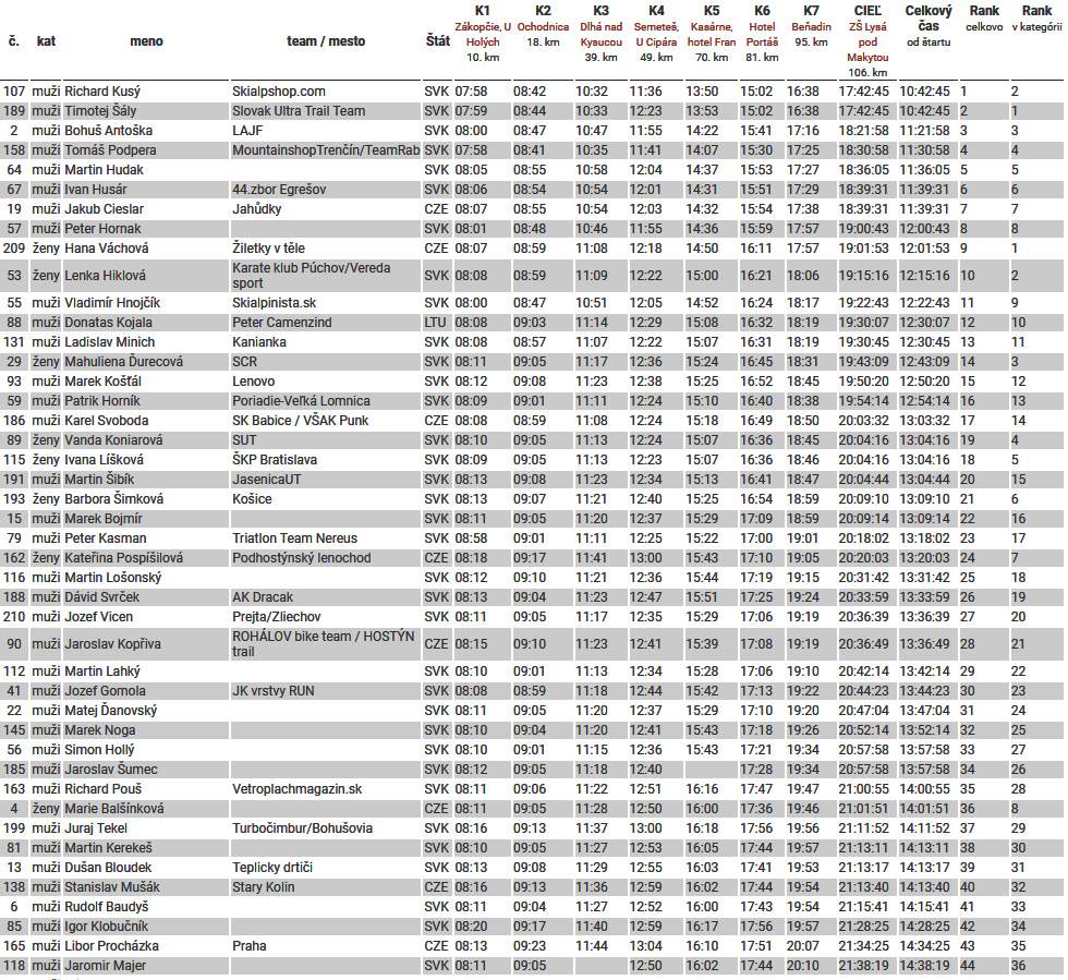 Len pre úplnosť – najrýchlejšie to zvládla dvojka Timo Šály a Rišo Kusý (ten na svojej premiérovej stovke) za 10:43 a Hana Váchová za 12:02. Stupne najlepších doplnil Bohuš Antoška (11:22), stálica Lenka Hiklová (12:15) a novicka Mahuliena Ďurecová (12:43), tiež na svojej prvej stovke. Klobúk dole! Kompletné výsledky sú tu na Hikingu , samozrejme. Ostáva len dúfať, že takto o rok znovu v Čadci, ešte s početnejším štartovým davom a minimálne s rovnakou chuťou fajne sa zničiť a zároveň si to užiť. Vraj sa to dá zároveň :-)