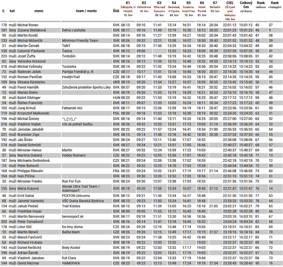 Tma na posledných úsekoch je pre niekoho asi aj milosrdná – napríklad že nevidí, ako brutálne sa dvíha pod nohami terén pred Makytou. Ale ani dlhánsky zbeh z nej na poslednú kontrolu v Beňadíne nie je pre rozsekané nohy žiadna lahôdka. Potom posledných asi deväť kilákov je už plynulých, hore aj dole. Ale pre veľa ľudí asi aj nekonečných, že?