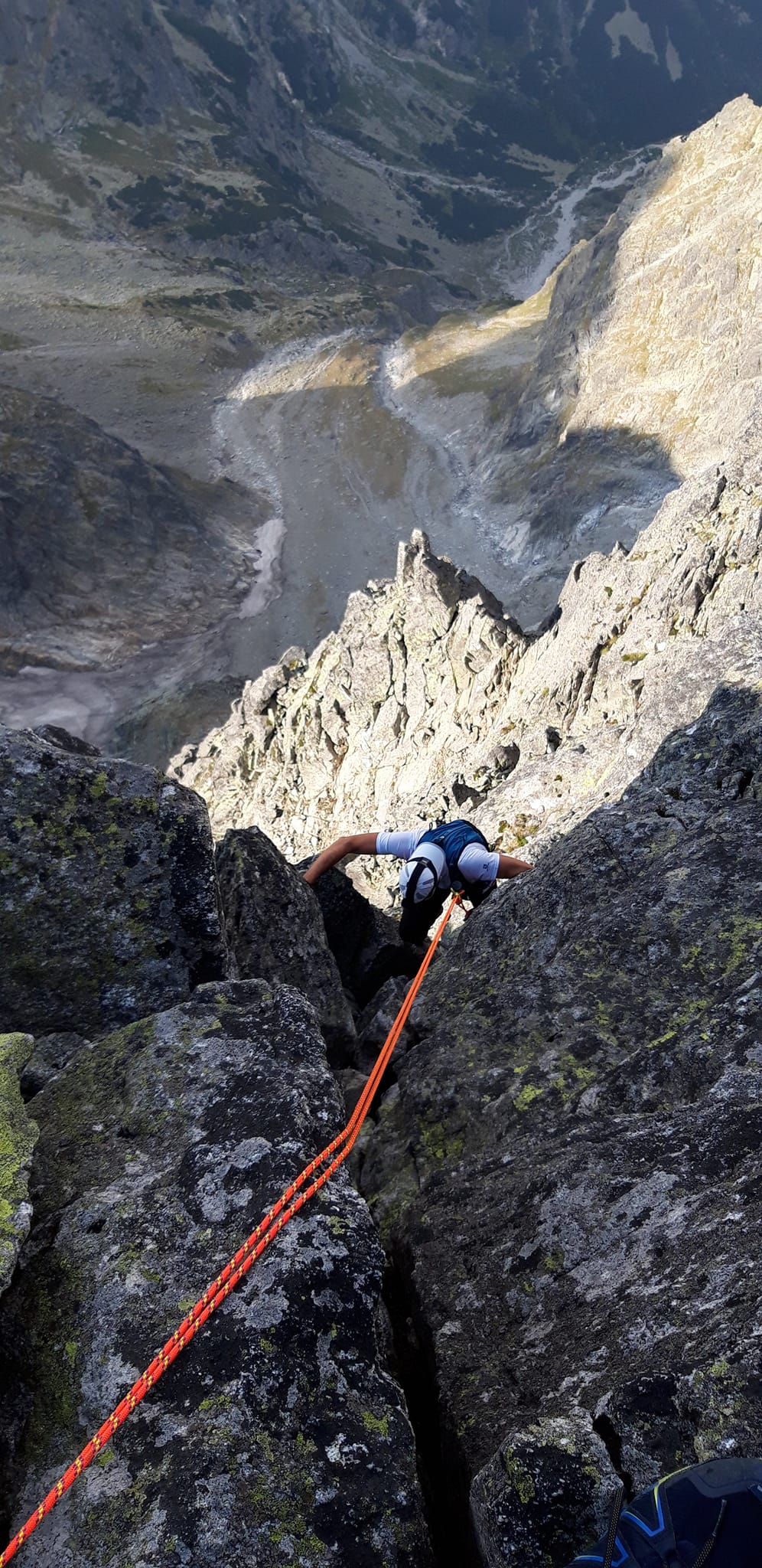 Po dokonalom resete schádzame do Nižnej Medenej štrbiny. Tá kávička ma nenormálne napružila. Cítim sa ako Hermann Buhl, keď si šľahol pervitín a na bicykli sa vybral z Insbrucku vysólovať si Cassina na Piz Badile. Feri sa nestíha čudovať. Vidlový hrebeň miestami doslova utekám. Hamujú ma len zlaňáky.