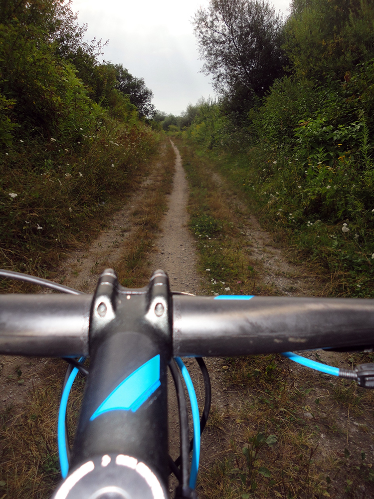 Ďalšia úloha je trafiť na rázcestie Drgová a tam preťať modrú značku (zo Sučian na Malý Kriváň). Najskôr jemne líznem podhorské lúky nad Trusalovou, stúpam zase po asfaltke. Pred jej koncom výrazná odbočka doľava do lesa. Spočiatku je lesná cesta široká, ale staršia, takže pekná, potom pribudnú rúbaniská. Ale aj výhľady dole do podhoria, napríklad na vojenskú strelnicu nad Sučanmi. Asi dve tretiny výšľap a posledná zjazd. Len pred koncom výšľapu sa treba poriadnejšie priprieť (strmo je tam a rozbito) - asi pol kilometra, ale jazditeľné všetko.
