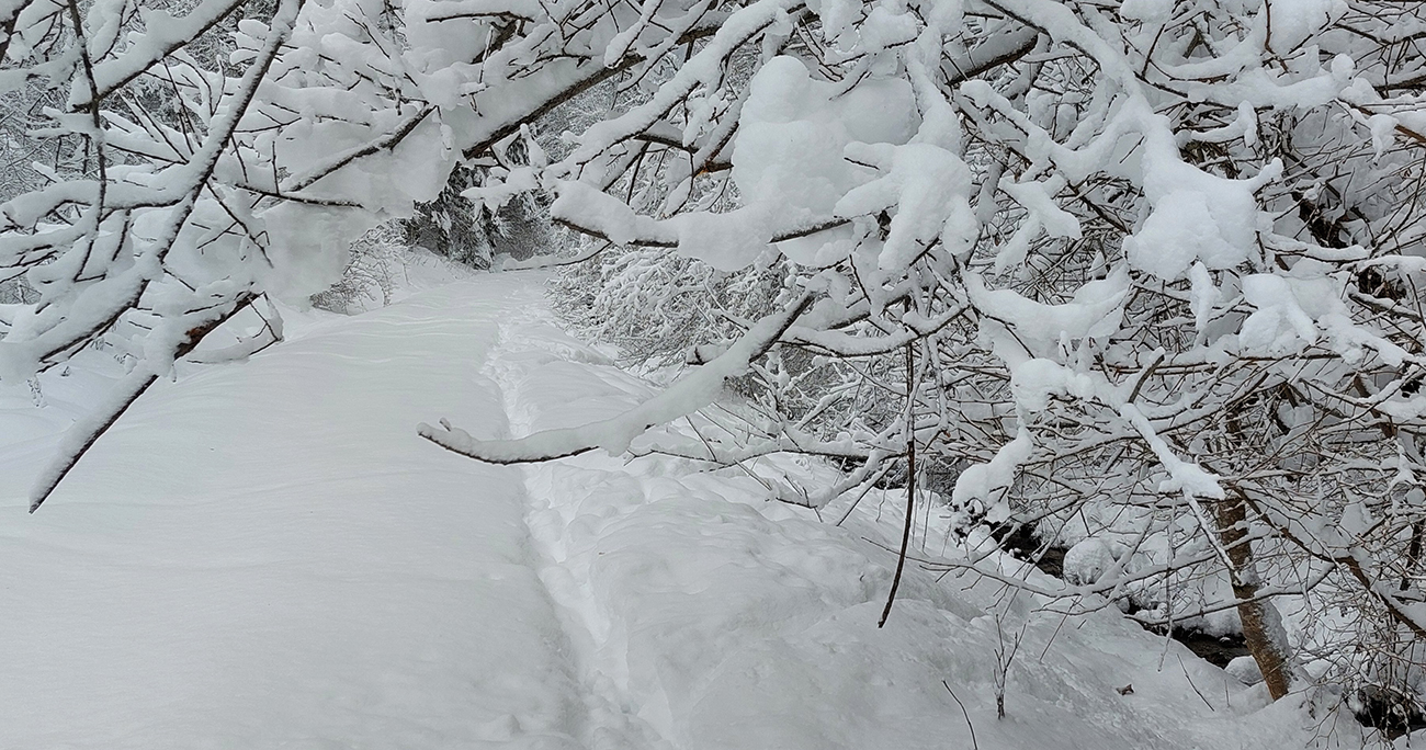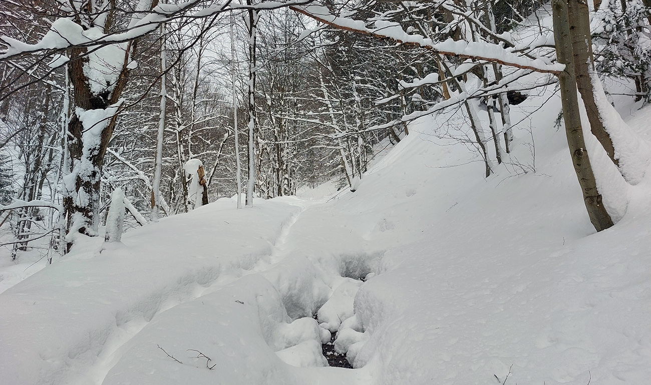 Posledné stovky metrov som už aj mimo náznaku starej stopy radšej dupal, lebo navlhnutý sneh už začínal tuhnúť a na jeho povrchu som sa akosi menej boril v porovnaní s čerstvo zafúkanou a zahladenou stopou. Novej nádielky bolo teda prebohato, ale to len na oko – napríklad prameniská priamo na chodníku zapadnuté neboli. Cez to najväčšie som skoro až lyže prenášať musel a cez potok popri zničenom mostíku už nebolo pomoci. Tak či tak, palice už nie do polovice, ale do dvoch tretín, ufff...