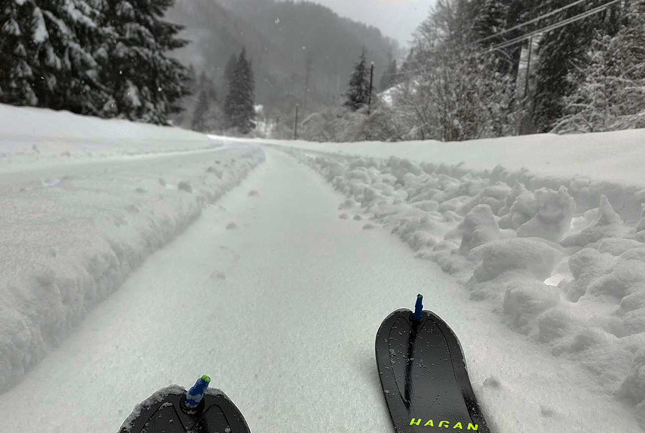 Nazad potom plavným sklzom vo vlastnej koľajnici, medzičasom už trochu zapadnutej. Až som sa divil, čo mi to smerom hore tak dlho trvalo :-) Dole stretko podľa dohody a padla ďalšia, že mám ešte hodinu pre seba, tak davaj pre zmenu hore hlavou dolinou, využiť vyleštenú koľaj po autách. Ale v noci padal mokrý, aj nad ránom bolo ešte nad nulou, tak tá stopa bola poriadne mydlová a pre garnižky príliš široká, nebola to až taká výhra. Tak zase nazad. Ale v doline to žilo – kravky bučali, traktory vrčali, sem - tam zapadnuté a snehom zapadnuté auto...