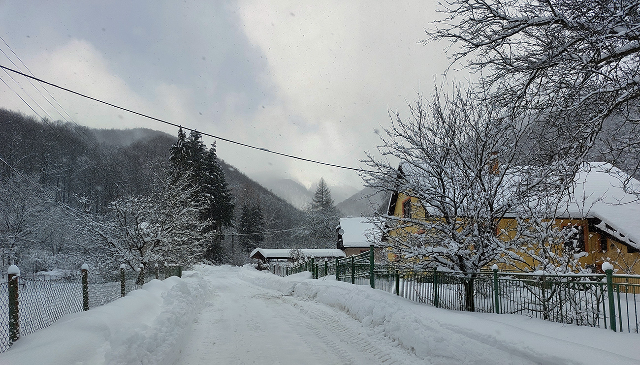 Medzi domami akurát zúril traktor s radlicou, tak až po chatu Vodopád prudký komfort po vypluhovanej, alebo nad Fatrankou aspoň po traktorom prebehnutej ceste. Asi z každého dvora šramotili lopaty a hučali frézy. Už bolo po snehových prívaloch, už len také pro forma prehánočky sa krajinou presúvali.