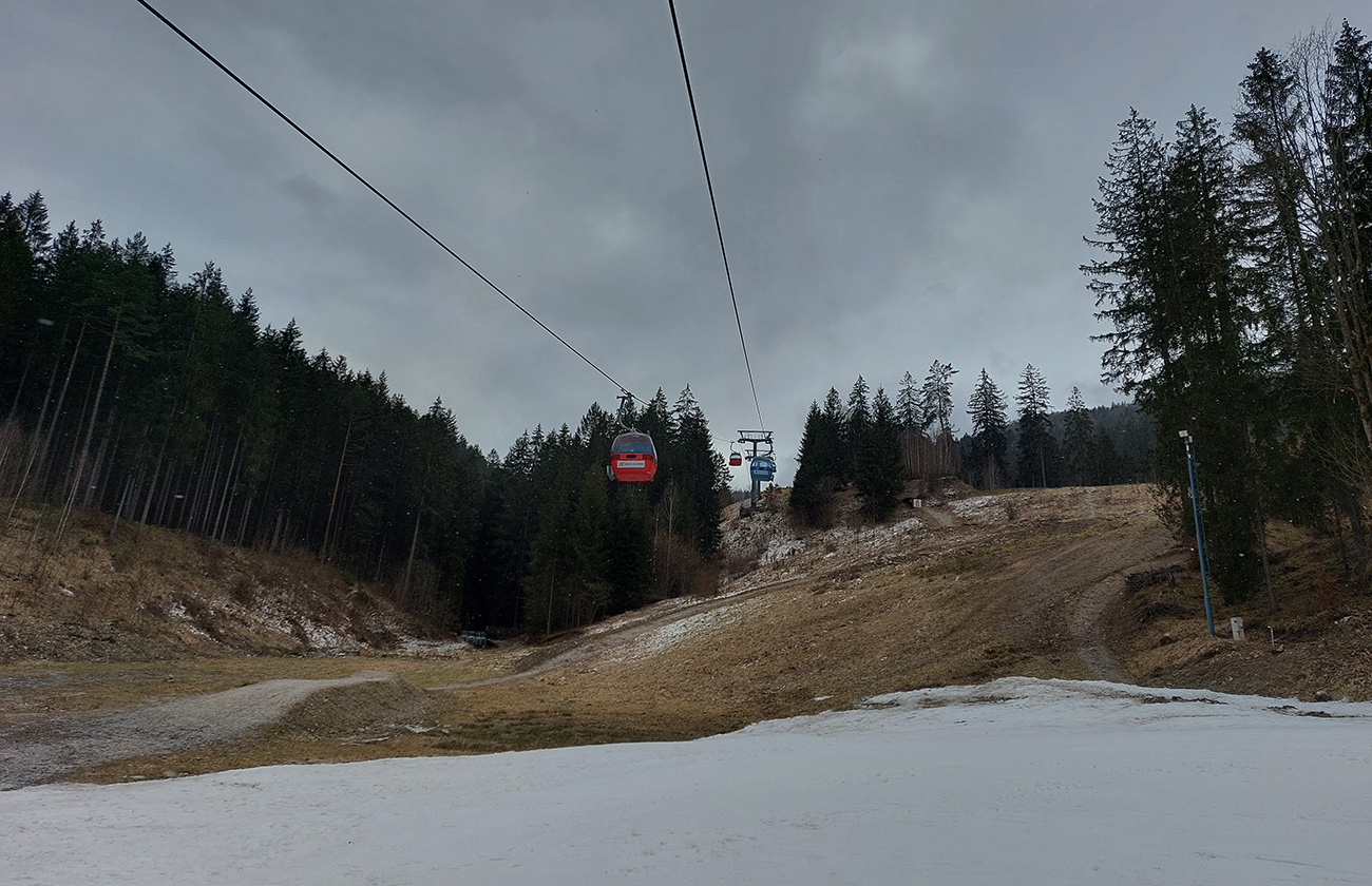 Skúsili sme ale oblúčiky spod Šiprúňa. Tak také premenlivé: hore ufúkaný prášok, nižšie hnusná kôrka a nad serpentínou cyklotrasy betónový firn. A ešte aj rozlyžovaný, hrčatý, z piatka a teplých dní, ktoré mu predchádzali.