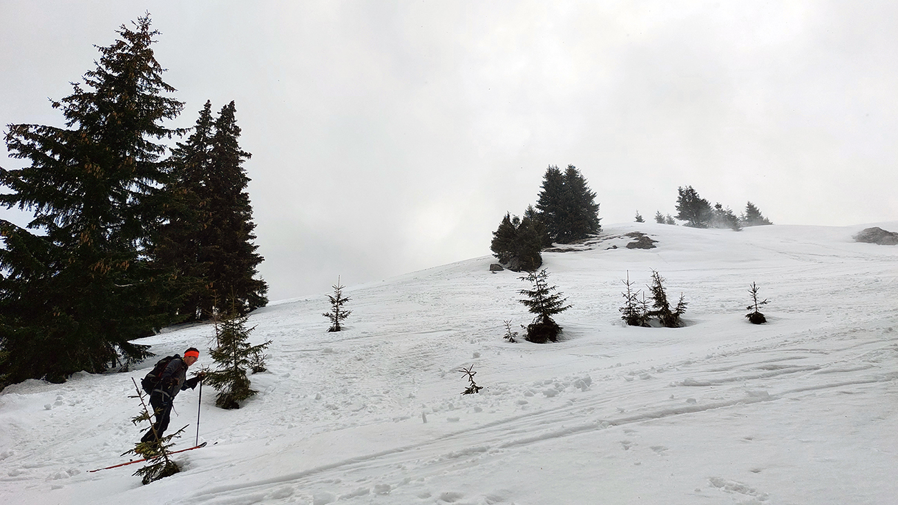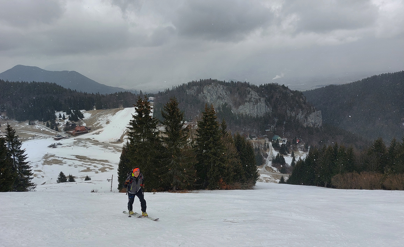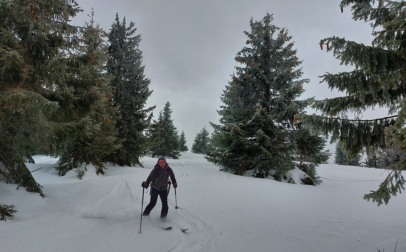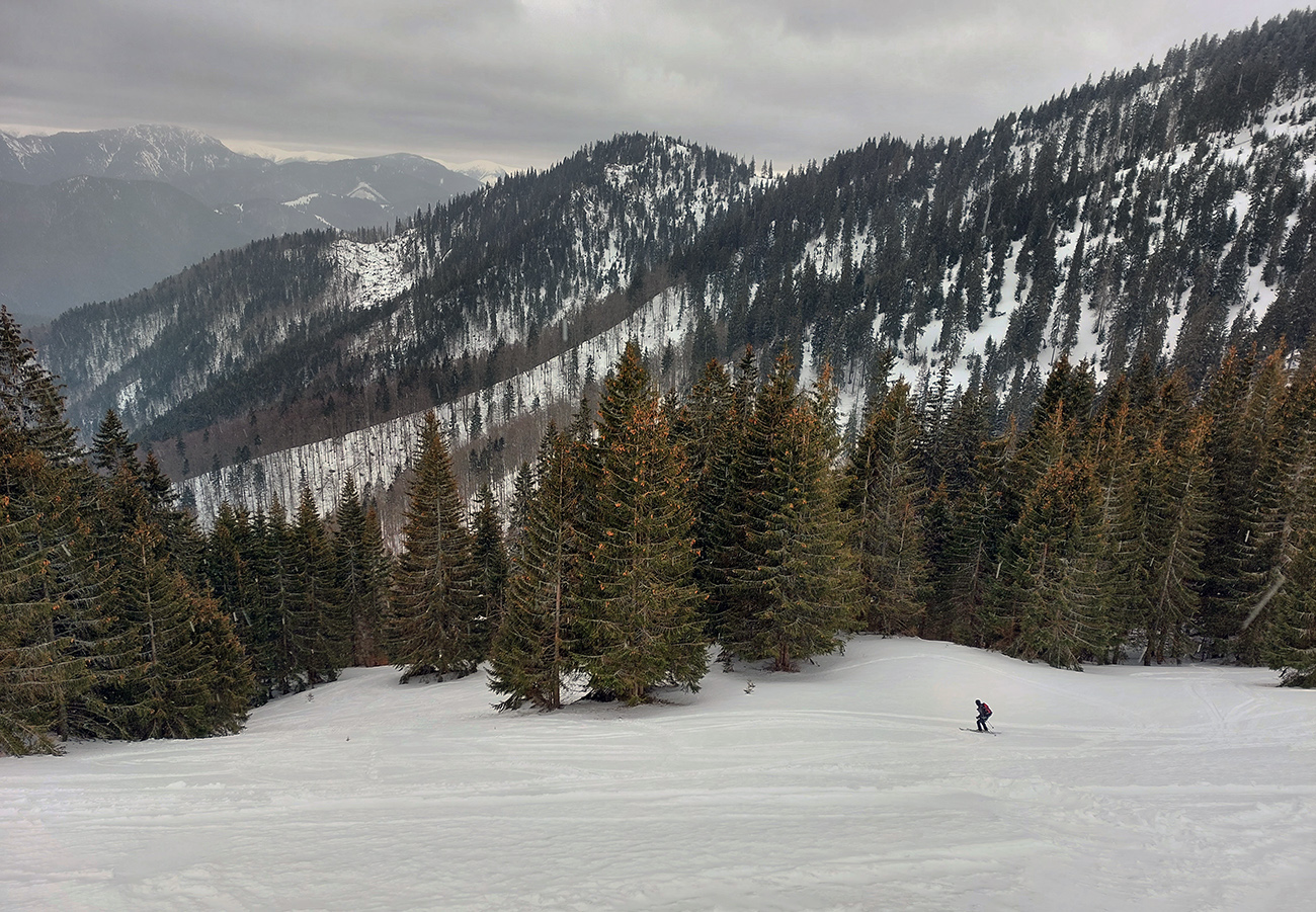 Napriek názvu boli podmienky aj hraničné, aj dobré. Ako je to možné? Tiež sme sa divili, aj keď tie hraničné podmienky dominovali. Ale že tam nájdeme aj prášok na pár oblúkov, to sme teda skoro neverili. Ale poporiadku. Prechádzajúci studený front v nedeľu 5.3. síce zabezpečil na víkend nevyhnutné zhoršenie počasia, jemné poletovanie snehových vločiek a trochu menej jemný severáčik, ale na druhej strane ešte nezabezpečil komfortné prekrytie na kameň zamrznutých, špinavých a hrboľatých firnov novým snehom. To hádam príde, predpoveď je sľubná. Brutálne teplá predošlých dní zase zabezpečili, že na južne exponovaných svahoch okolo Vtáčnika len tak – tak, že netreba lyže v rukách nosiť. Citlivejšie povahy asi aj nosia. Haršajzne sme nepoužili, no na niektorých miestach by trochu aj pomohli.