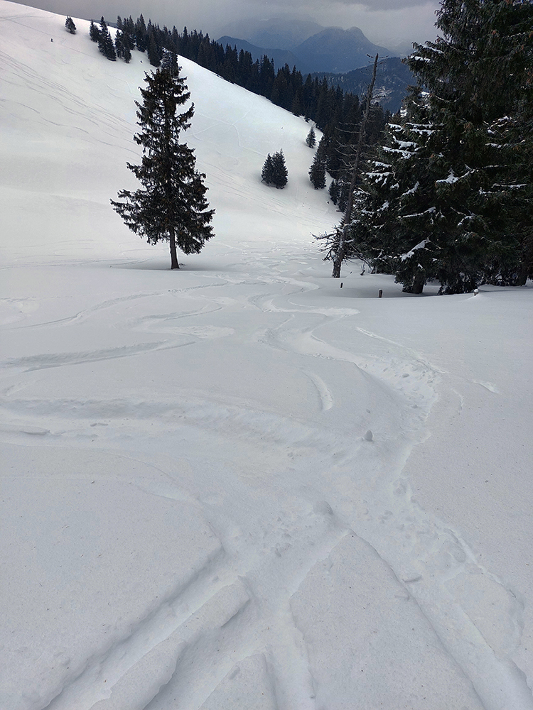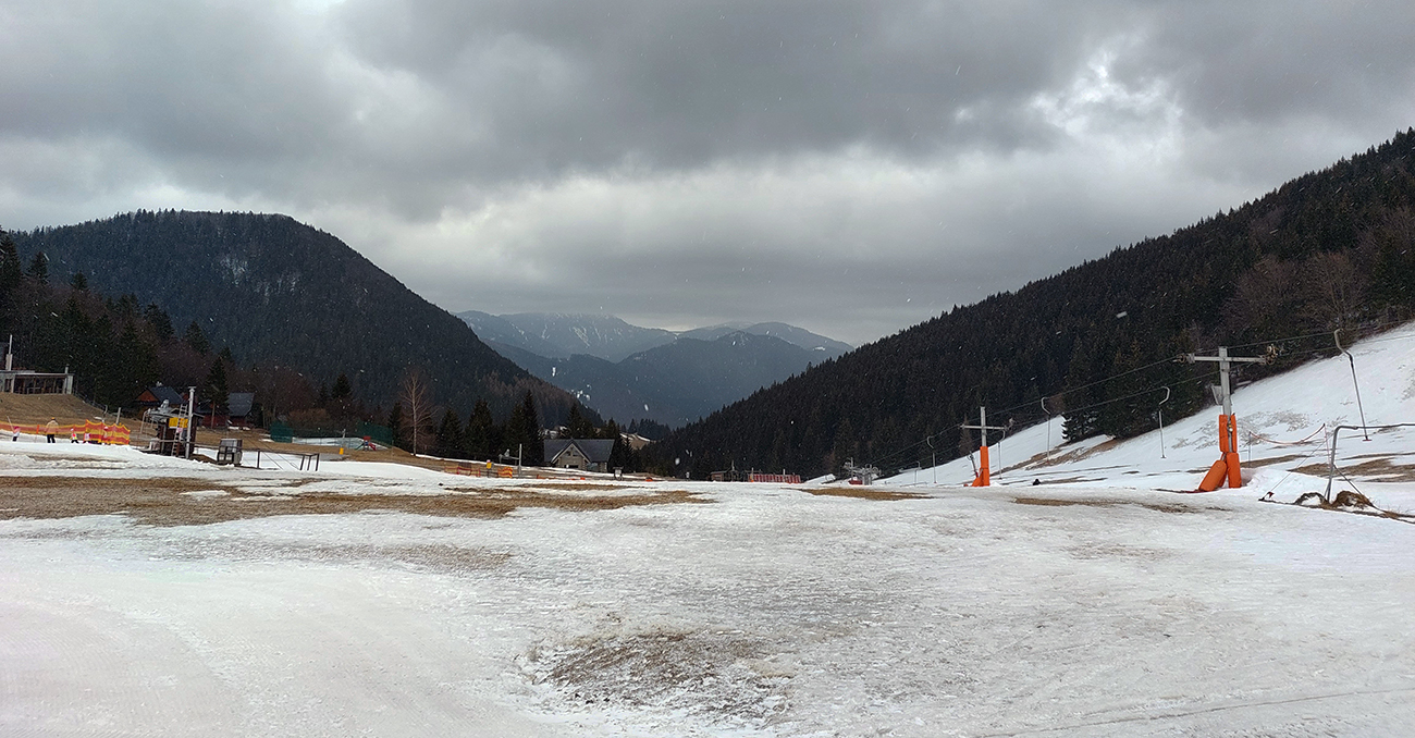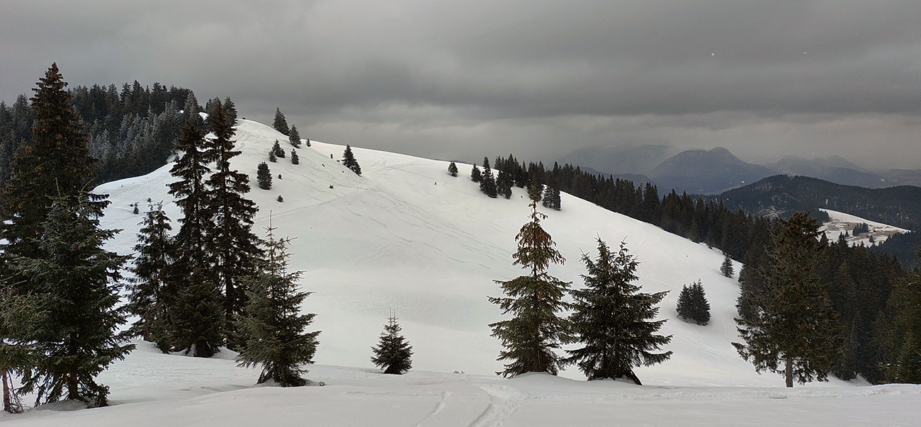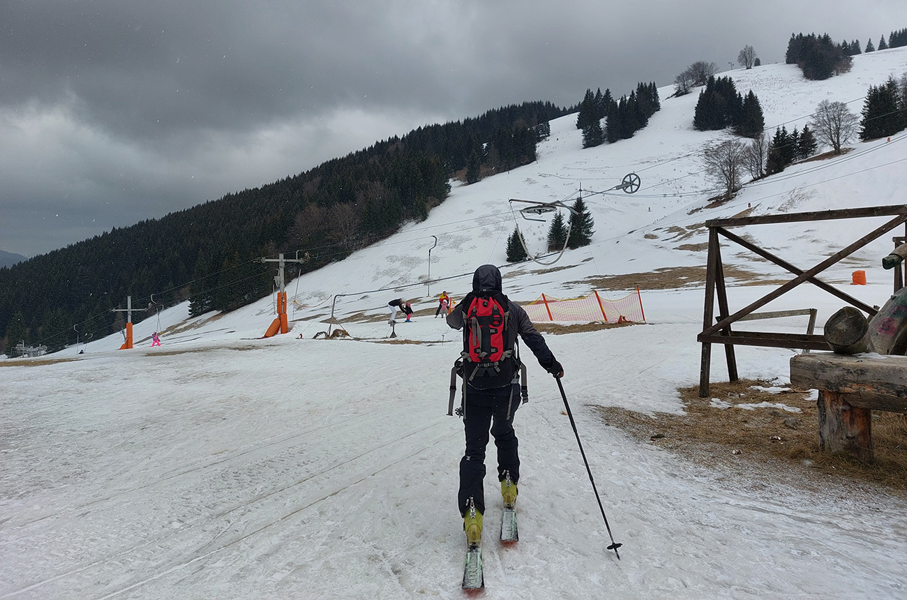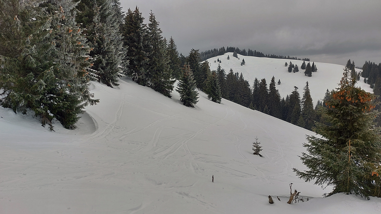 Napriek názvu boli podmienky aj hraničné, aj dobré. Ako je to možné? Tiež sme sa divili, aj keď tie hraničné podmienky dominovali. Ale že tam nájdeme aj prášok na pár oblúkov, to sme teda skoro neverili. Ale poporiadku. Prechádzajúci studený front v nedeľu 5.3. síce zabezpečil na víkend nevyhnutné zhoršenie počasia, jemné poletovanie snehových vločiek a trochu menej jemný severáčik, ale na druhej strane ešte nezabezpečil komfortné prekrytie na kameň zamrznutých, špinavých a hrboľatých firnov novým snehom. To hádam príde, predpoveď je sľubná. Brutálne teplá predošlých dní zase zabezpečili, že na južne exponovaných svahoch okolo Vtáčnika len tak – tak, že netreba lyže v rukách nosiť. Citlivejšie povahy asi aj nosia. Haršajzne sme nepoužili, no na niektorých miestach by trochu aj pomohli.