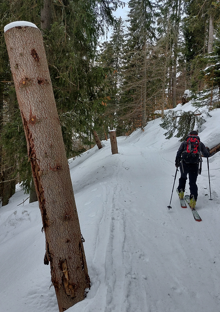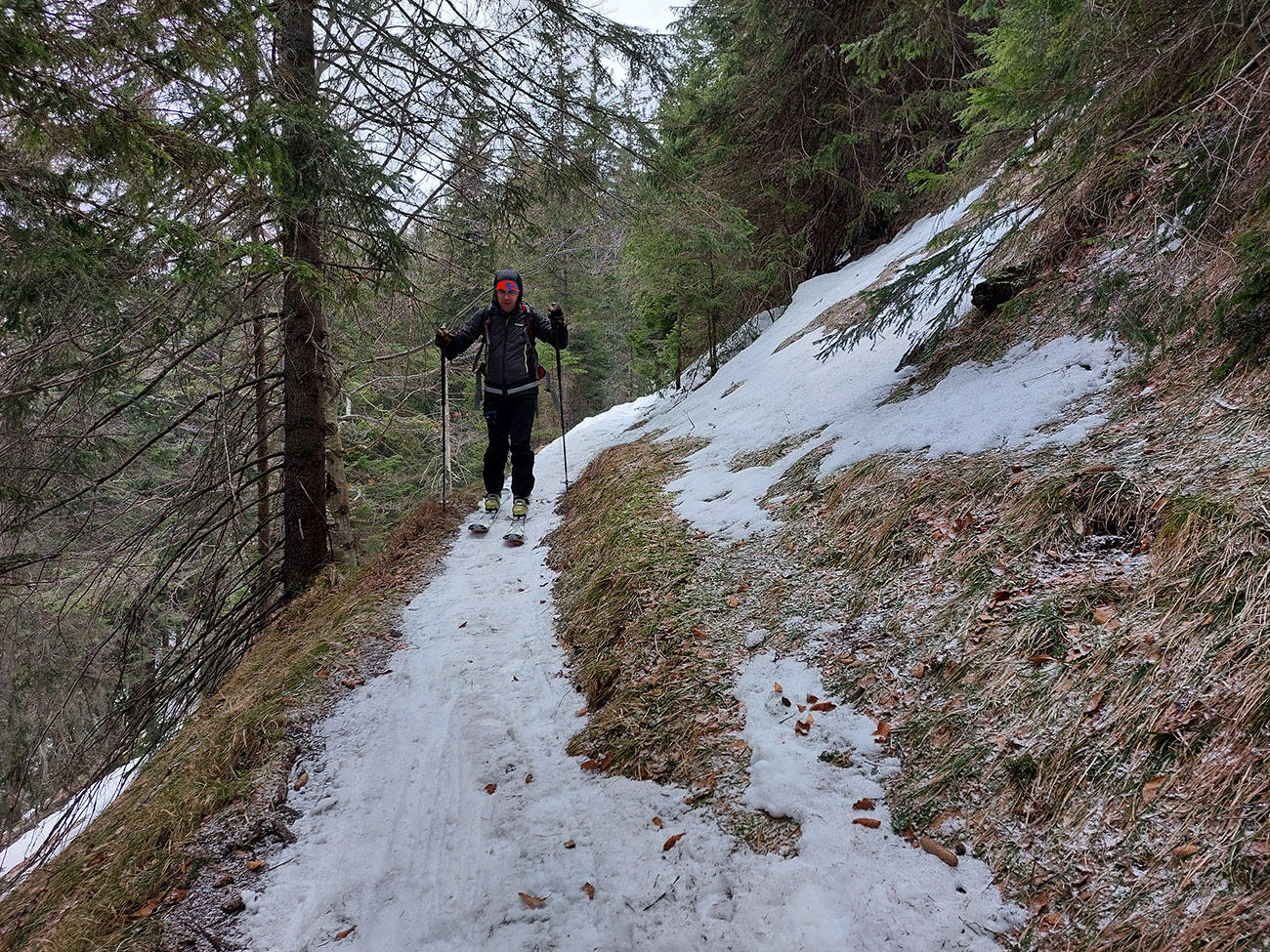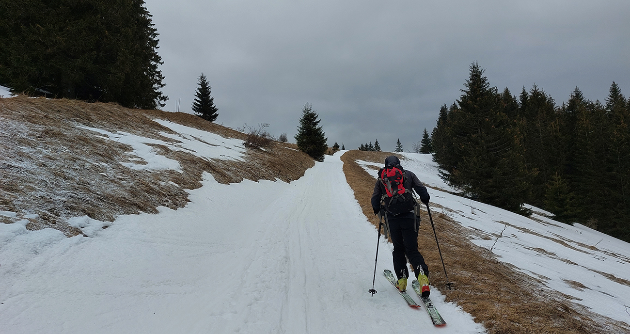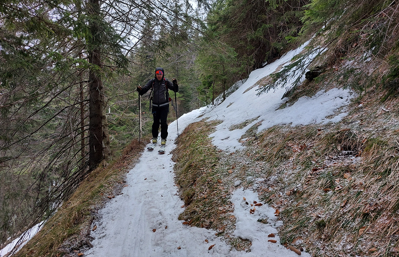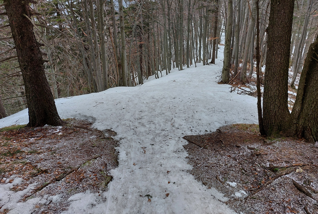 Traverzy lesom okolo Nemeckého vrchu už sú poriadne tragické - najmä na južnom svahu v závere, pred východom na lúku, lepšie ísť možno aj pešo ako na pásoch. Aj zopár poriadne „zúžených miest“ a špinavý ľad.