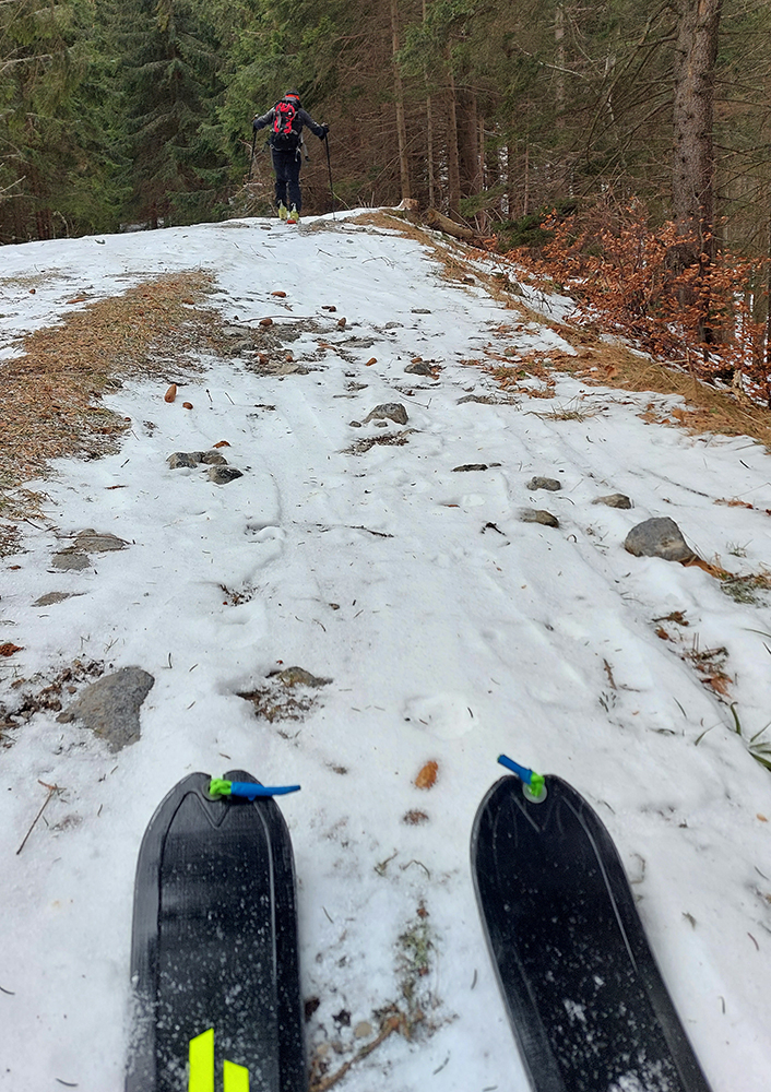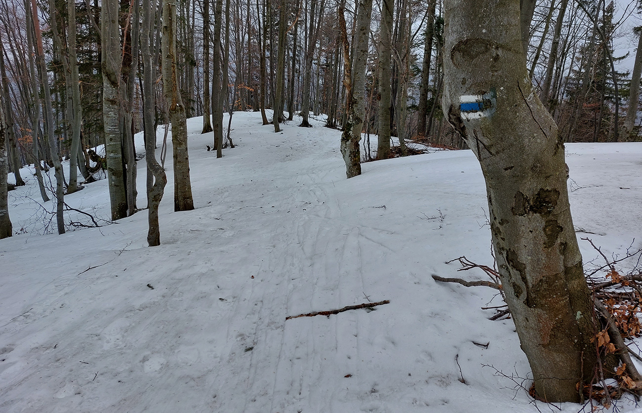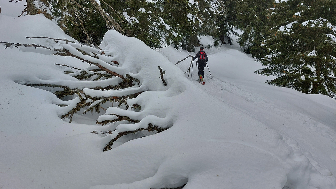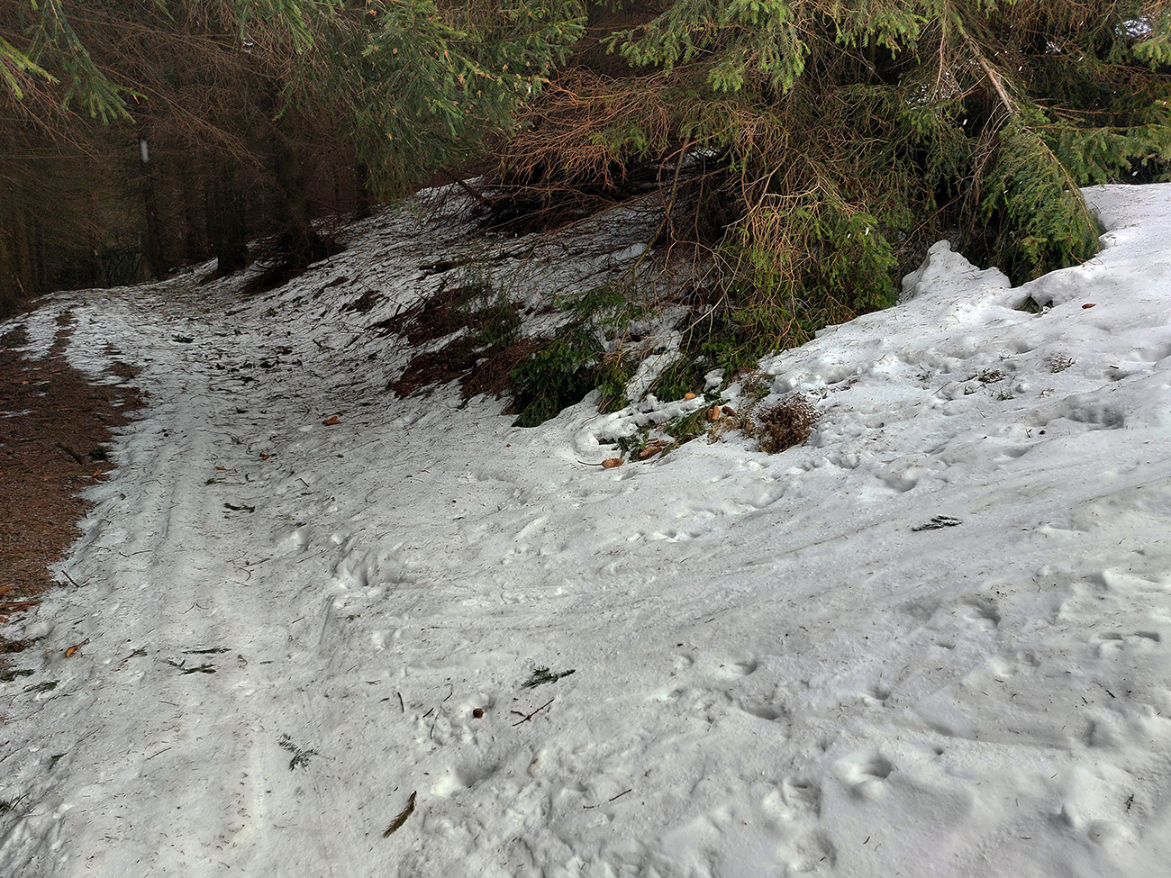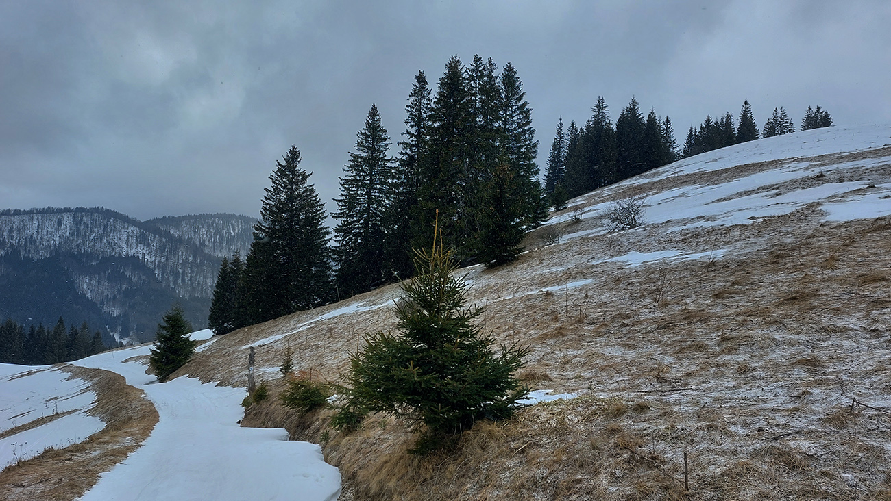 Traverzy lesom okolo Nemeckého vrchu už sú poriadne tragické - najmä na južnom svahu v závere, pred východom na lúku, lepšie ísť možno aj pešo ako na pásoch. Aj zopár poriadne „zúžených miest“ a špinavý ľad.