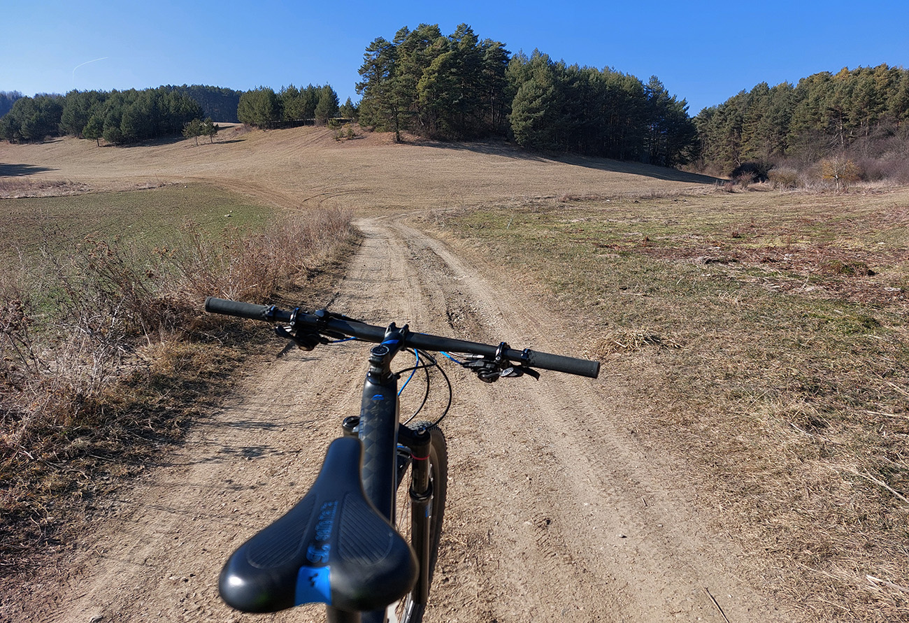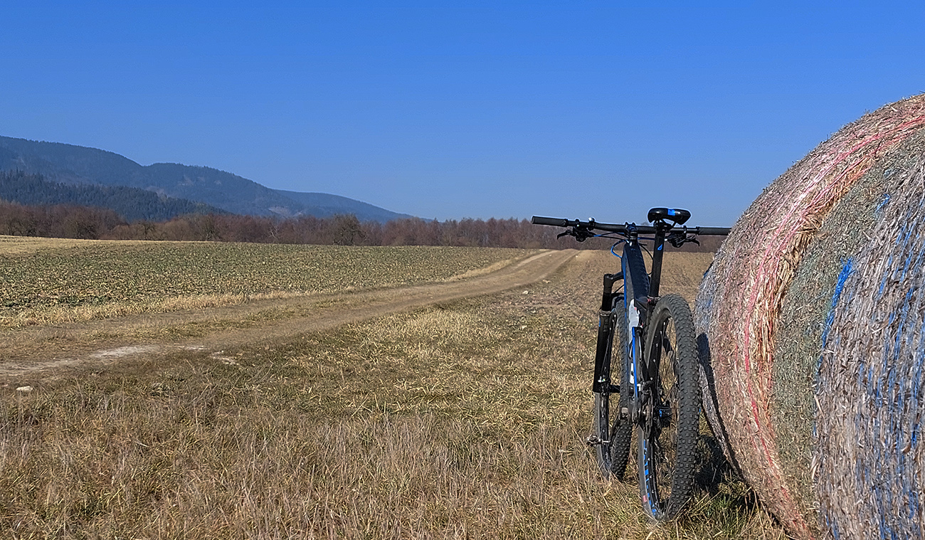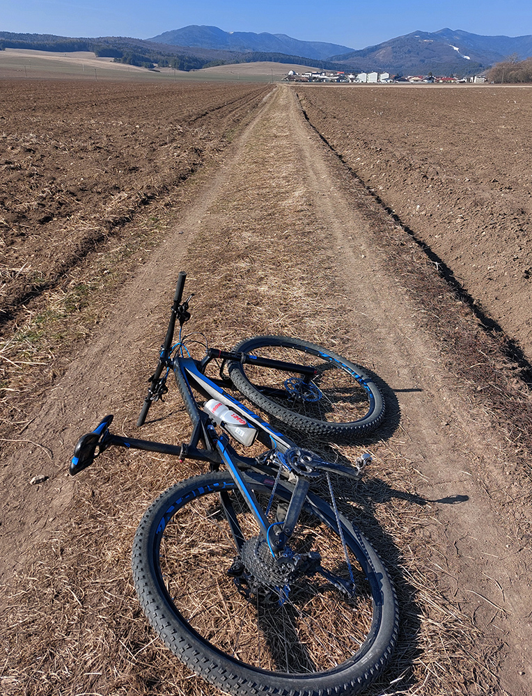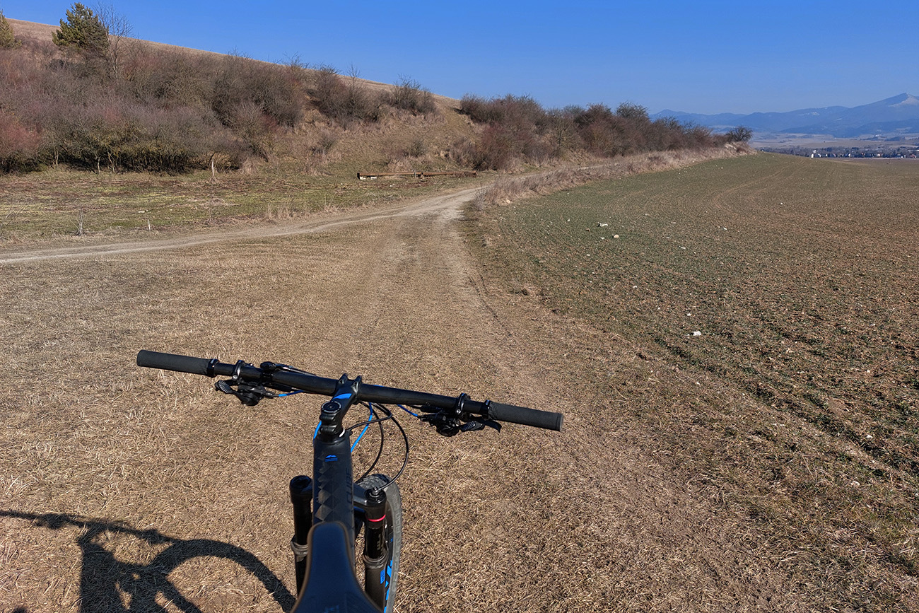 Na Bystričke jednoducho krížom pomedzi domy a ponad ihrisko prvá pravá cezpoľná cykloturistika. Do Petra ešte po hline, potom pod Trebostovom čiastočne len okrajom poľa, v stopách po poľovníckych autách. Jedine tam je to neprepojené, inak na celej trase normálne poľno-lúčne cesty. Zlákala ma aj odbočka dole do nivy Turca, ale som sa rýchlo otočil, keď sa stratila v kroví. Tak aj prevod vyprošťovák prišiel k slovu, na krátku chvíľu.