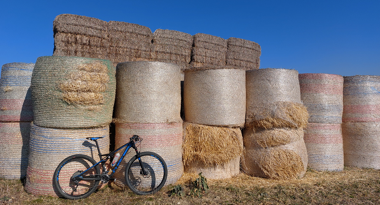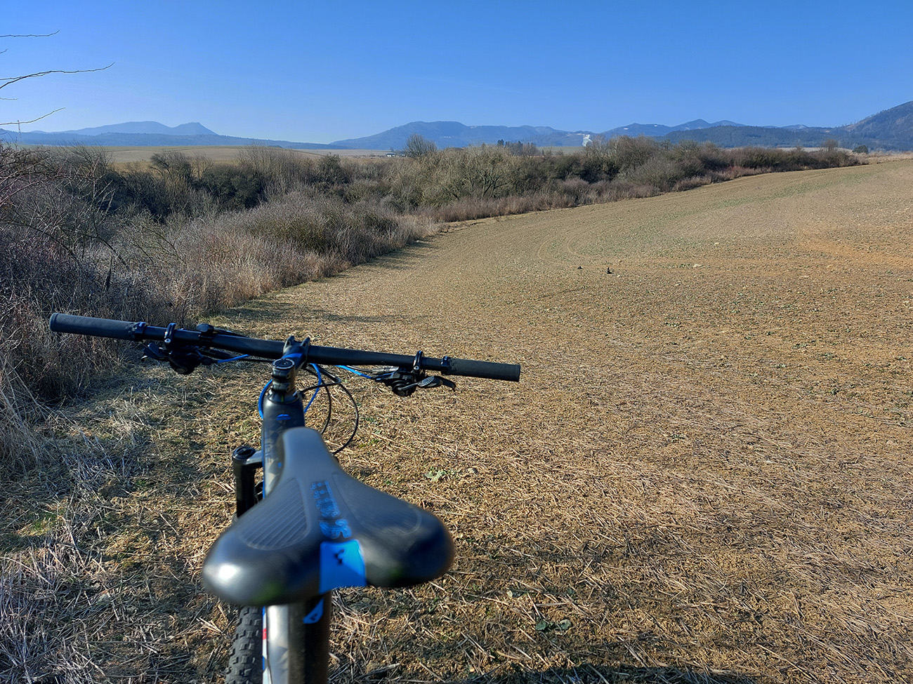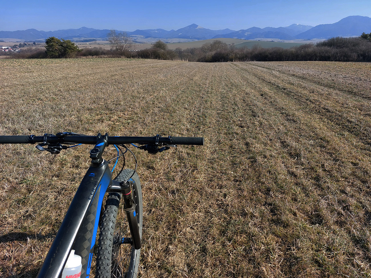 Na Bystričke jednoducho krížom pomedzi domy a ponad ihrisko prvá pravá cezpoľná cykloturistika. Do Petra ešte po hline, potom pod Trebostovom čiastočne len okrajom poľa, v stopách po poľovníckych autách. Jedine tam je to neprepojené, inak na celej trase normálne poľno-lúčne cesty. Zlákala ma aj odbočka dole do nivy Turca, ale som sa rýchlo otočil, keď sa stratila v kroví. Tak aj prevod vyprošťovák prišiel k slovu, na krátku chvíľu.