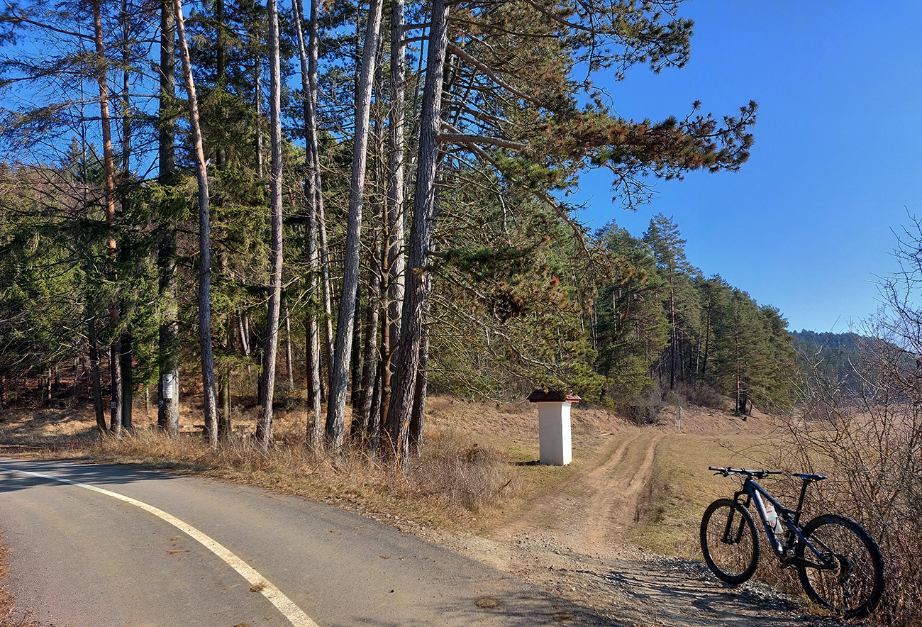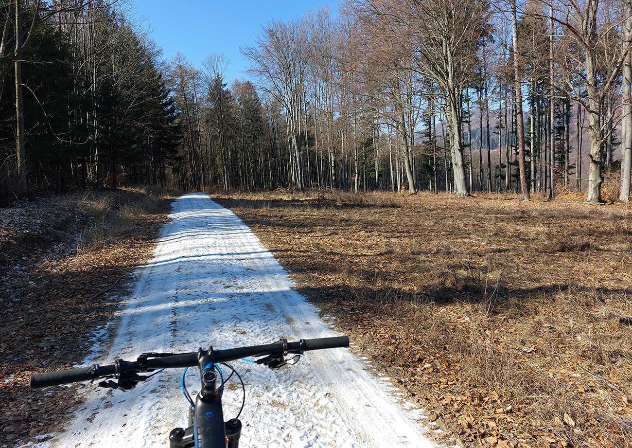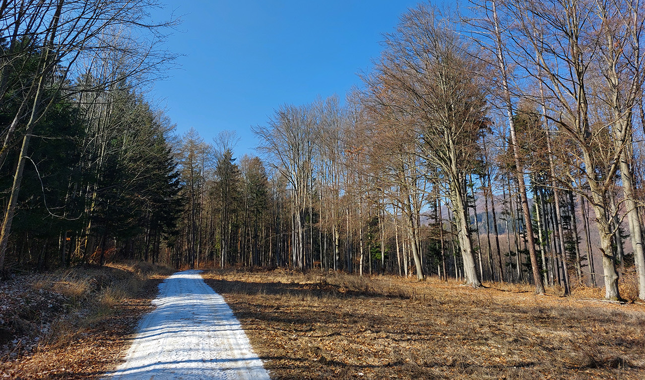 Tam v úvaline za dedinou, pri starom napájadle na Šiatrikovskej, doprava – so zámerom obísť ten veľký ostrov lesa a vrátiť sa zľava. Príjemne sklonené stúpanie, hore aj zvyšky snehového poprašku na ceste, v lese samozrejme ničovaté nič.