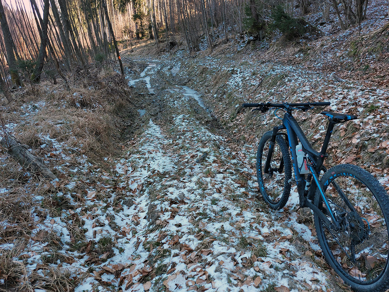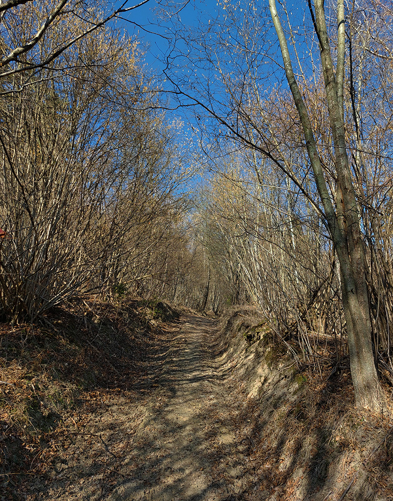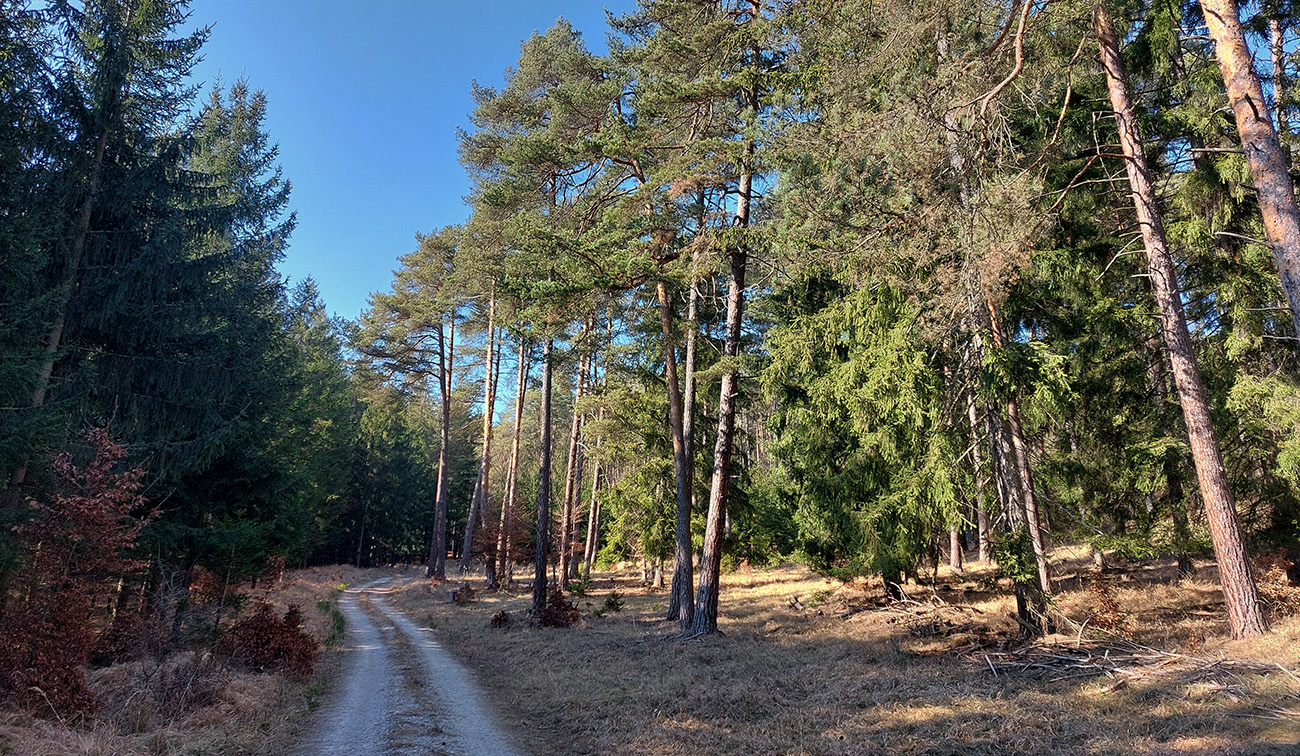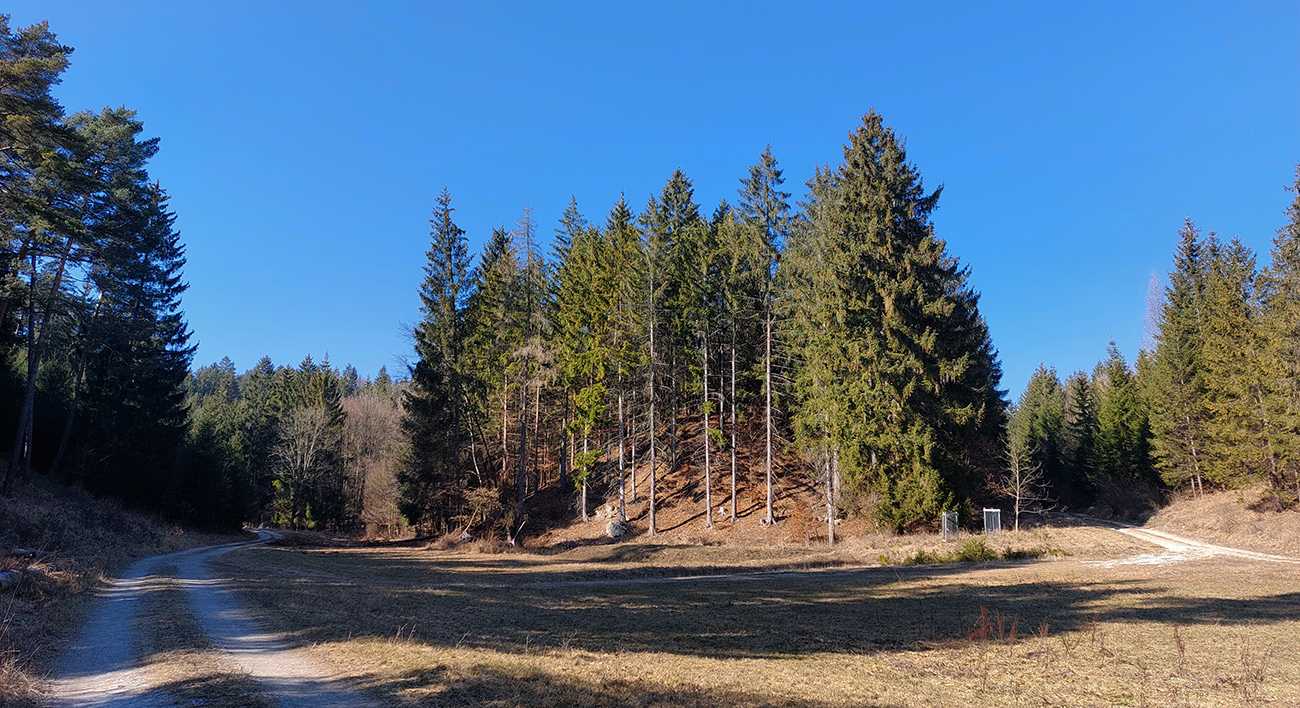 Tam v úvaline za dedinou, pri starom napájadle na Šiatrikovskej, doprava – so zámerom obísť ten veľký ostrov lesa a vrátiť sa zľava. Príjemne sklonené stúpanie, hore aj zvyšky snehového poprašku na ceste, v lese samozrejme ničovaté nič.