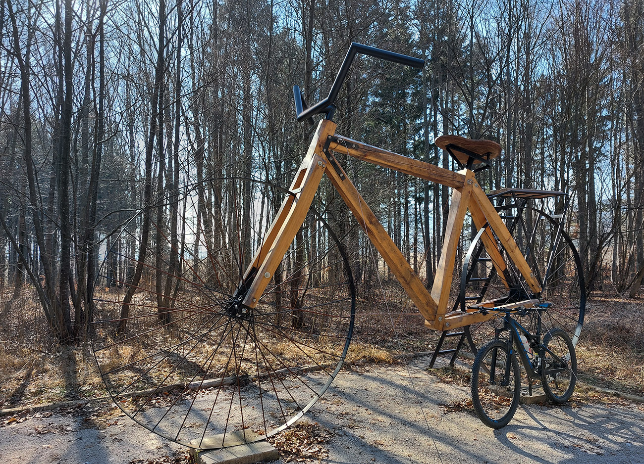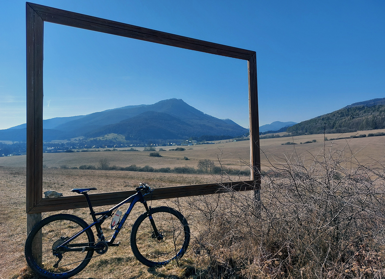 Povinná fotka bicykla pri megabicykli a cestou dole lúkami do Kláštora ešte jedna pri fotoráme, nech mám aj Zniev v zábere. Dole pred dedinou odbočka doľava, zase som využil kúsok asfaltovej cyklotrasy. Ale na mieste, kde vlieza do lesa, pekne doprava na šotolinu a popod horu do Slovian, obchádzať ten „ostrov lesa“ z juhu.