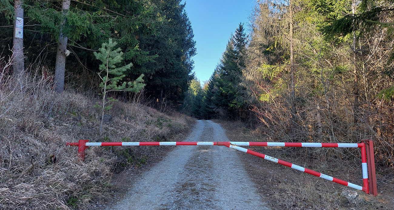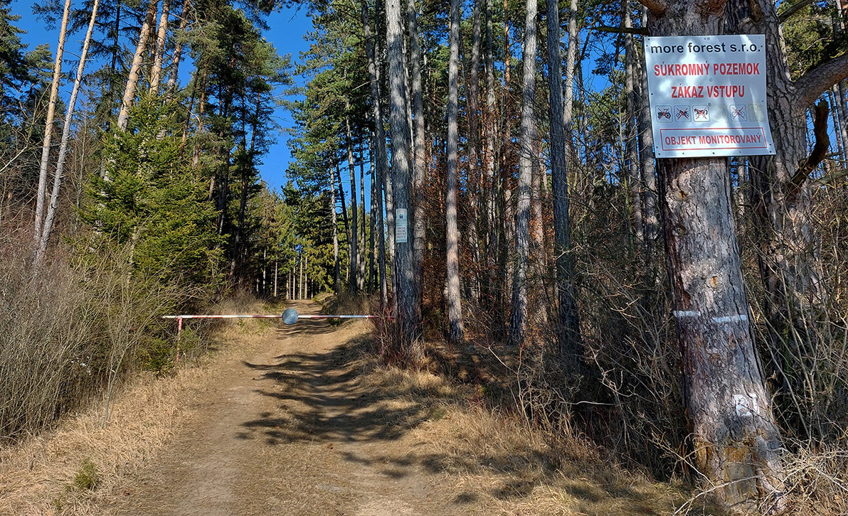 V Slovanoch sa úplne poza domy nezadarilo, tak som zas trochu poasfaltoval, ku kaplnke za dedinou. Od nej cesta jasná, priamo hore, do lesa. Ale tam rampa a megatabuľa so všemožnými zákazmi vstupu, aj pre bajky.