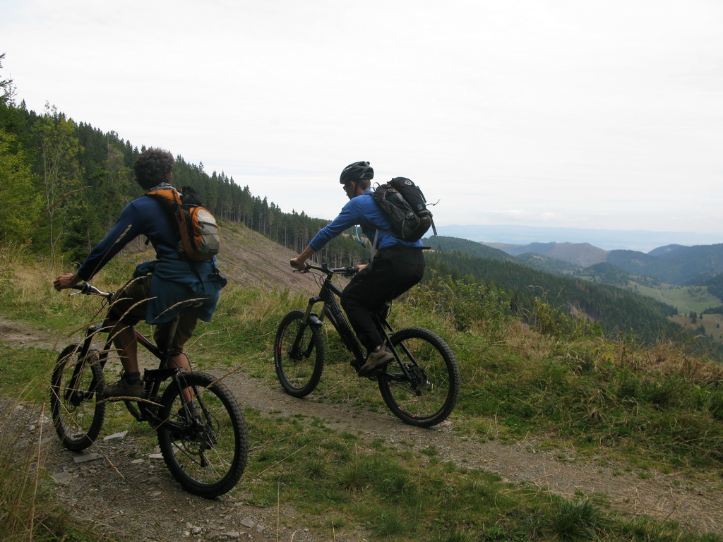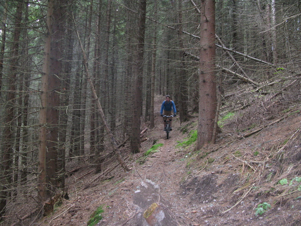 Púšťame sa do prvého zjazdu, prechádzame dolinkou, kde sú všade viditeľné známky lesných prác. Kopec zvyškov dreva, konárov, pníkov, cesta poškodená ťahaním dreva.