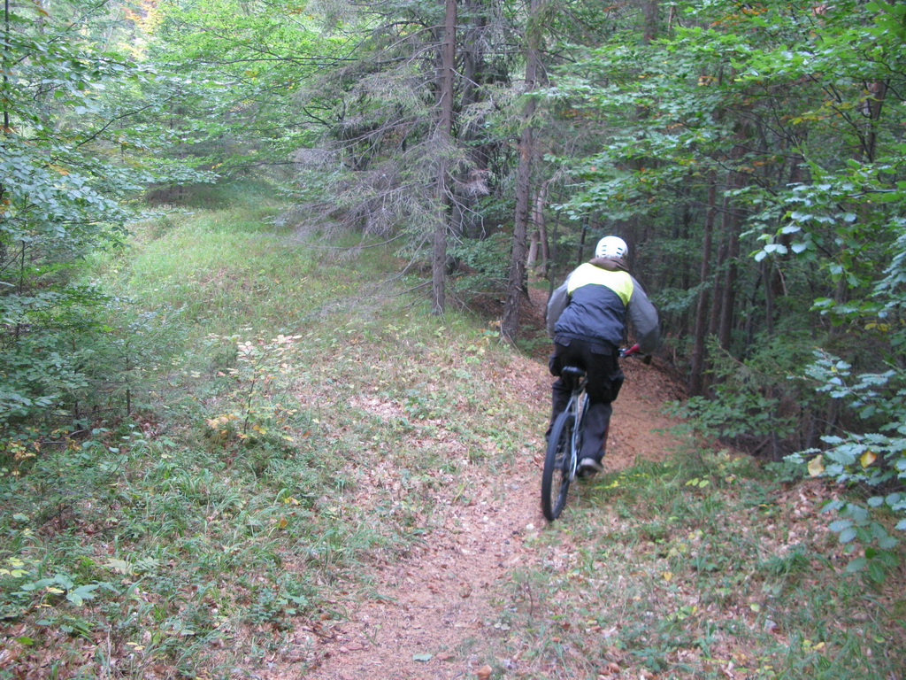 Zjazdujeme. Nádherný a divoký chodníček, sem tam zapadaný stromami. Všade plno pavučín. Na zemi hlboké lístie. Nad Vernárom sa napájame na najkrajšiu časť trailu. Tu domáci aktivisti spravili krásny zjazd s klopenkami a menšími skokmi, dá sa samozrejme prejsť aj bez skákania.