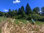 Nasledovala dávka detskej radosti: rýchlo dole lúkou, na vlnkách sa tu dá aj poskákať, no fakt ako deti... A slnko svieti, ale nepečie, čo viac chcieť? Za Kláštorom príjemná krajinka na pohľad aj na pojazd, popod ďalší rybník, striedavo lúkami a lesom, vybrali sme si kopcovitejší variant, nazad sa viac zvezieme.