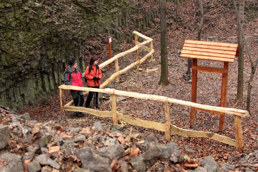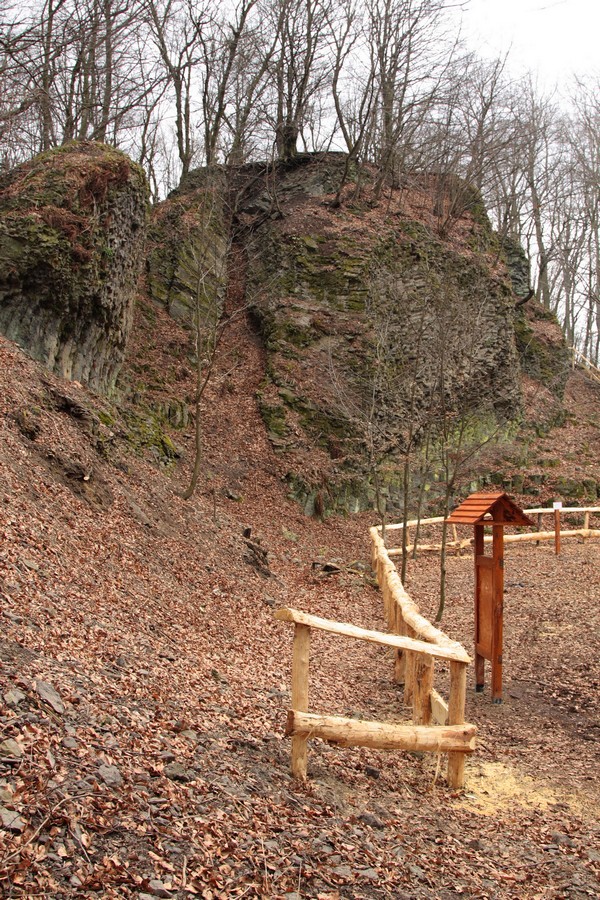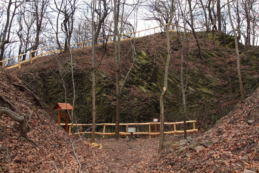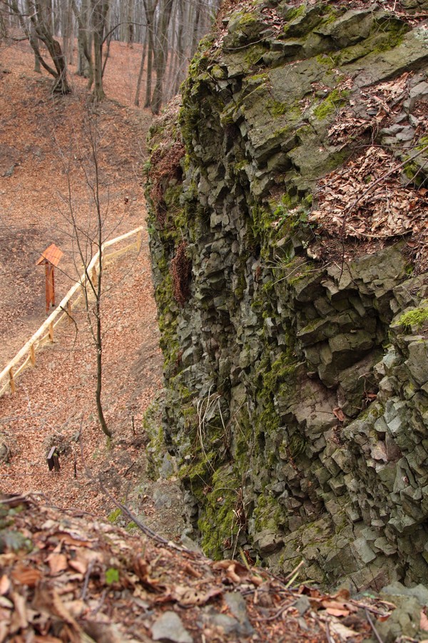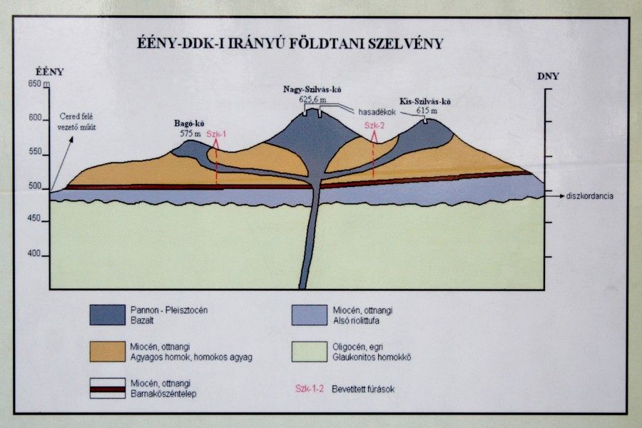 Široká a mierne rozbahnená lesná cesta nás už po pár desiatkach krokov doviedla k prvej z informačných tabúľ. Na naše príjemné prekvapenie boli písané aj po slovensky. Hovorili o histórii ťažby uhlia a bazaltu (čadiča) v tejto oblasti, čím objasnili pôvod miestnej atrakcie. Po niekdajšej ťažbe tu ostali odkryté 20 metrov vysoké skalné steny s typickou čadičovou odlučnosťou. Čo už je tak trochu raritou, je odlučnosť vo dvoch rôznych na seba navzájom kolmých smeroch. V areáli pod Nagy Szilvás-kő sú dva takého odkryvy, jeden manší a jeden väčší. V rámci bezpečnosti sú obohnané novučičkým dreveným zábradlím a doplnené infotabuľami. Teda zatiaľ len stojanmi, časom zrejme pribudne aj text :o)