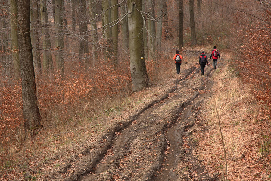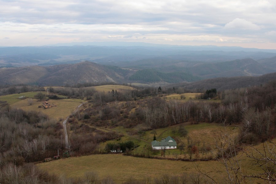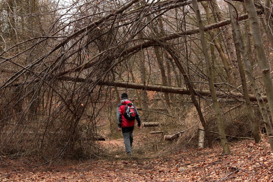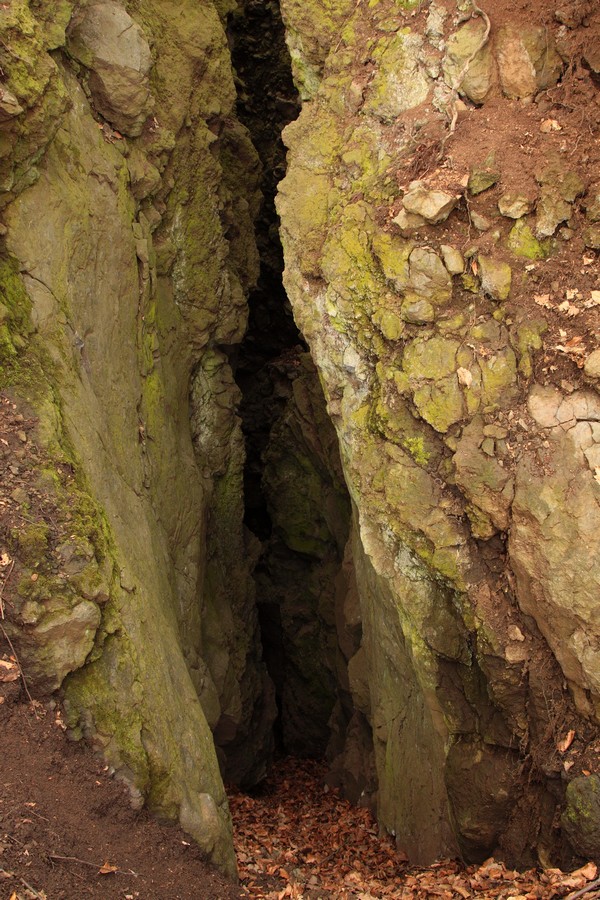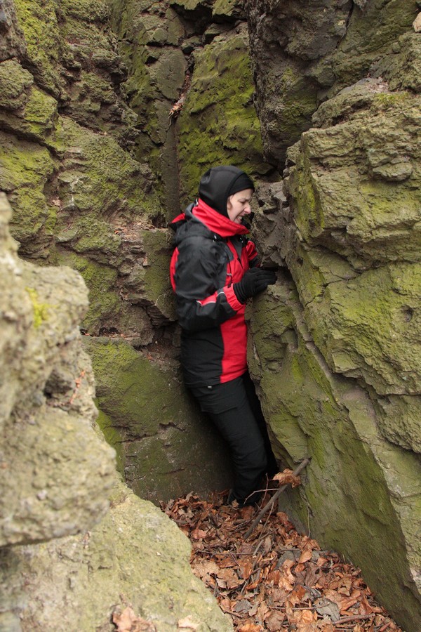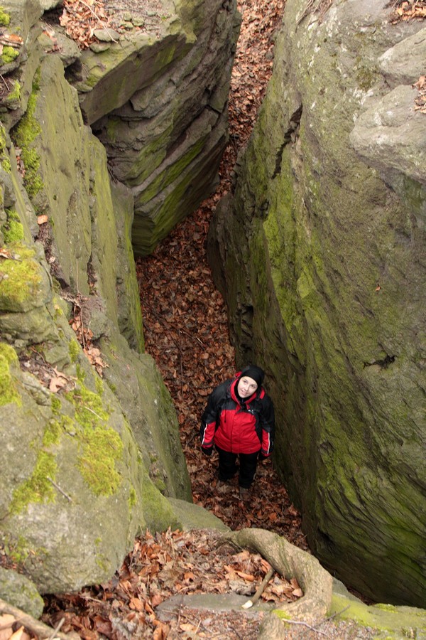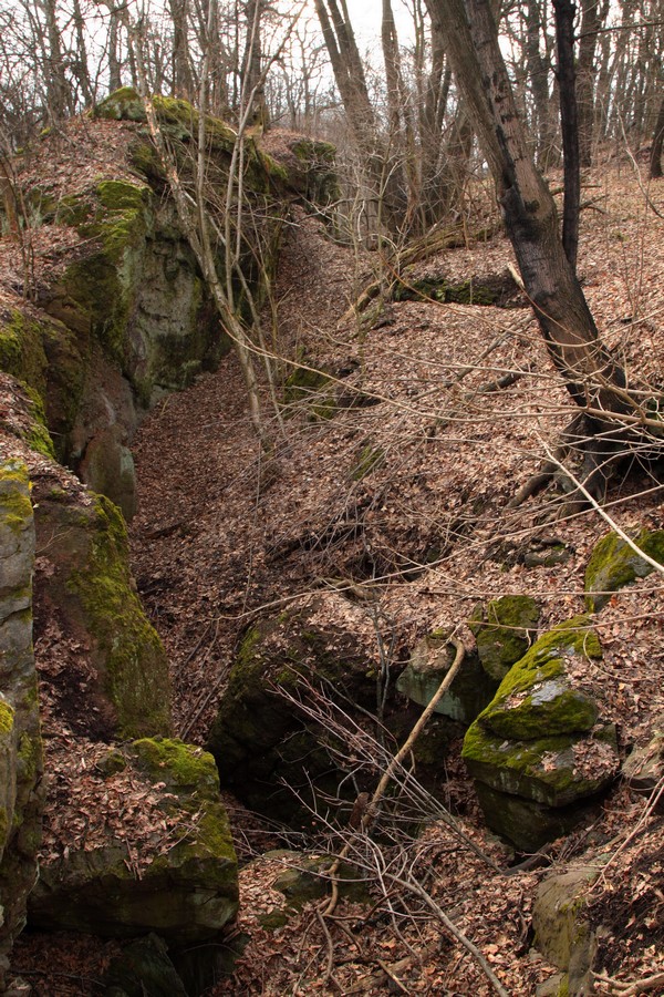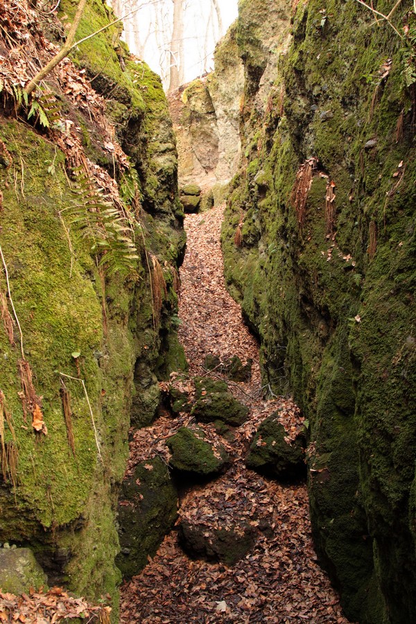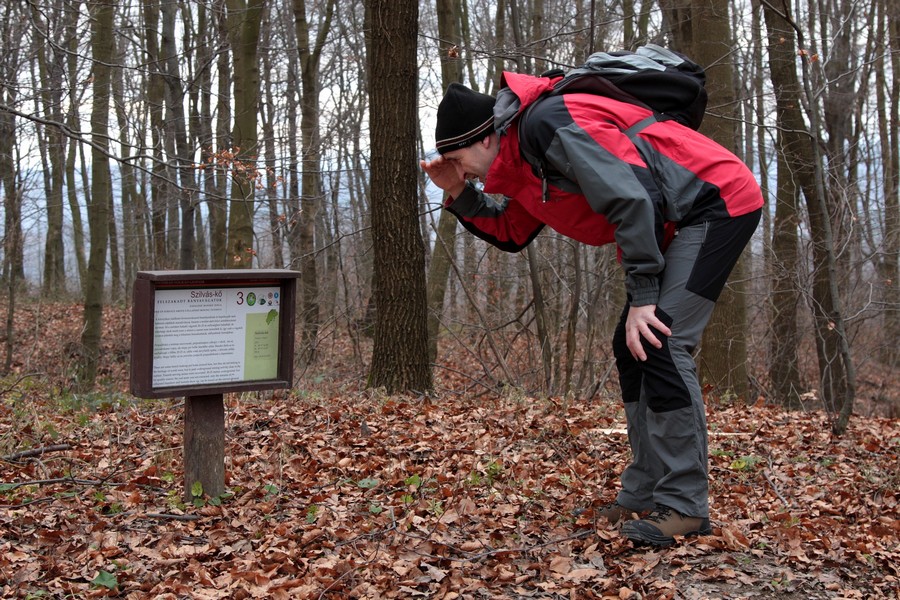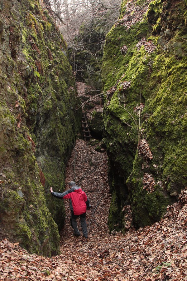 Odtiaľ sme už miernym stúpaním dosiahli vrchol Nagy Szilvás-kő (625 mnm). Výhľady so skaly sú aj v zime len obmedzené, skromná diera pomedzi stromy sa otvára len smerom na Tachty a Cerovú vrchovinu a čiastočne cez Szilváspuszta na východ. Nás však viac zaujali rôzne diery a prepadliny v skale, ktoré vraj vznikli zbortením banských chodieb. Čím viac sme sa vzďaľovali od vrcholu, tým sa praskliny viac otvárali a prehlbovali, až vytvorili steny akéhosi kaňonu. Pri informačnej tabuli, ktorá odhaľuje príčiny zlyhávania kompasu, sme už značku opustili a hnaní zvedavosťou zliezli medzi skalné steny. Kaňon má odhadom (v tomto som slabá, ale skúsim to) dĺžku 100 m a hĺbku do 15 m, dno je vystlané hrubou vrstvou lístia a steny obrastené machom. Je celý priechodný, na dvoch miestach to uľahčujú polorozpadnuté rebríky a staré horolezecké laná, ale my sme ho celý neprešli. Posledný úsek a výlez z kaňona je dosť strmý, úzky a zrejme aj po štyroch. Ale dá sa.