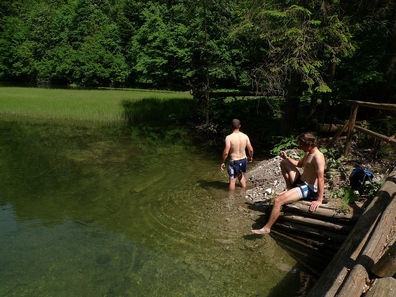 Kto by chcel, môže sa vrátiť po širokej kvalitnej zvážnici vrátiť na Geravy, my však pokračujeme ďalej dolinou až ku vodnej nádrži Klauzy. Extrémne teplá sobota nás nenechá dlho rozmýšľať. Turisti na obzore nie sú žiadni, zobliekame sa a šup ho do vody. Kúpeľ v ľadovej vode je osviežujúci a dôležitý pred tým, čo nás čaká.