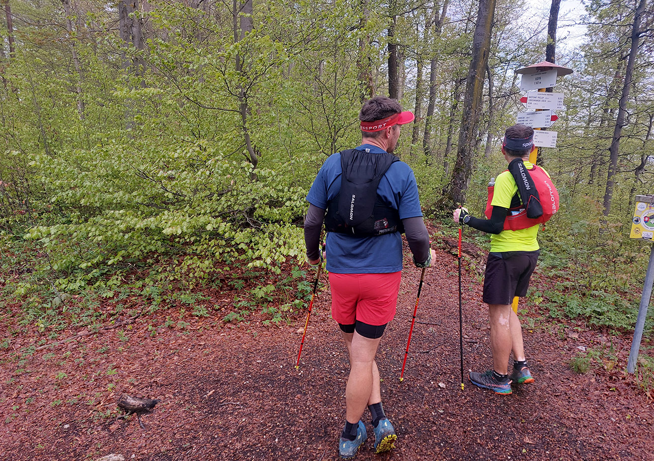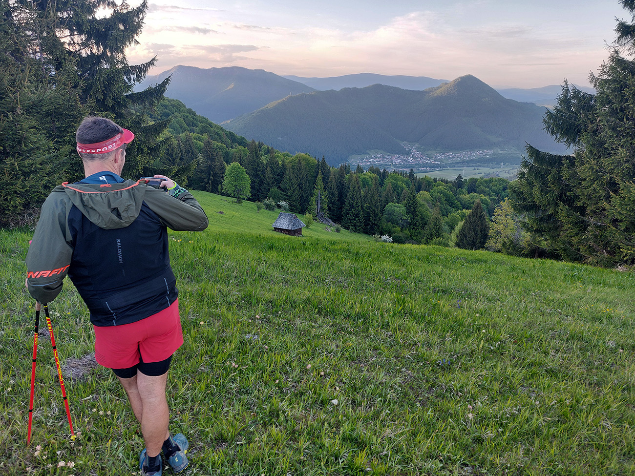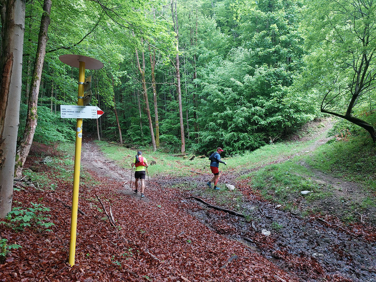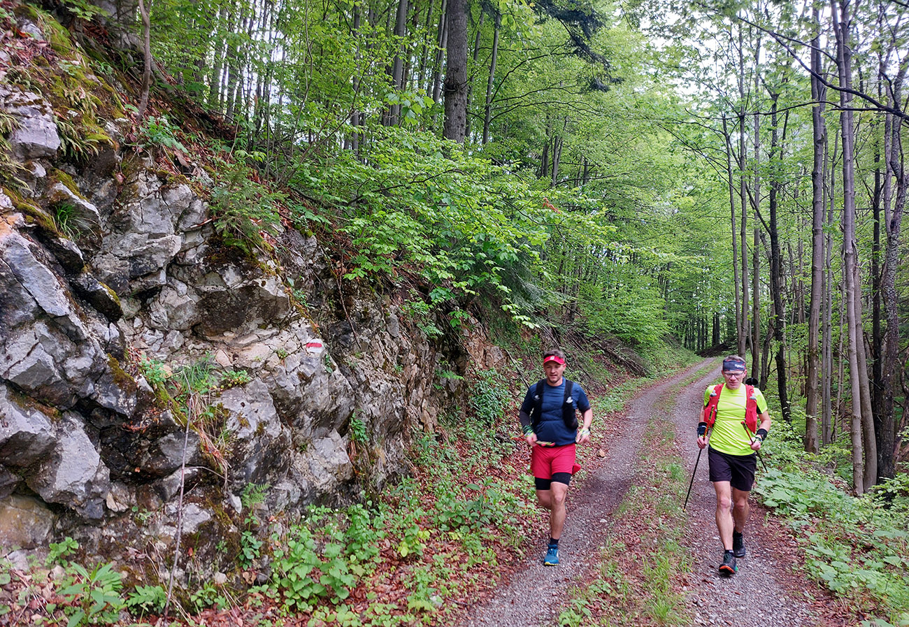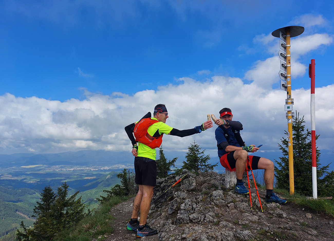Hore slniečko, fajnúčko, pauzička - na rožky a tyčinku. Ale pohľad na hodinky nepekný: prvých 17 kilákov za štyri hodiny! Neznalý by už panikáril, my domáci vieme, že po obrátke sa to zlepší. Len či potom ešte budú sily, že? Musia byť, čelovky nemáme.
