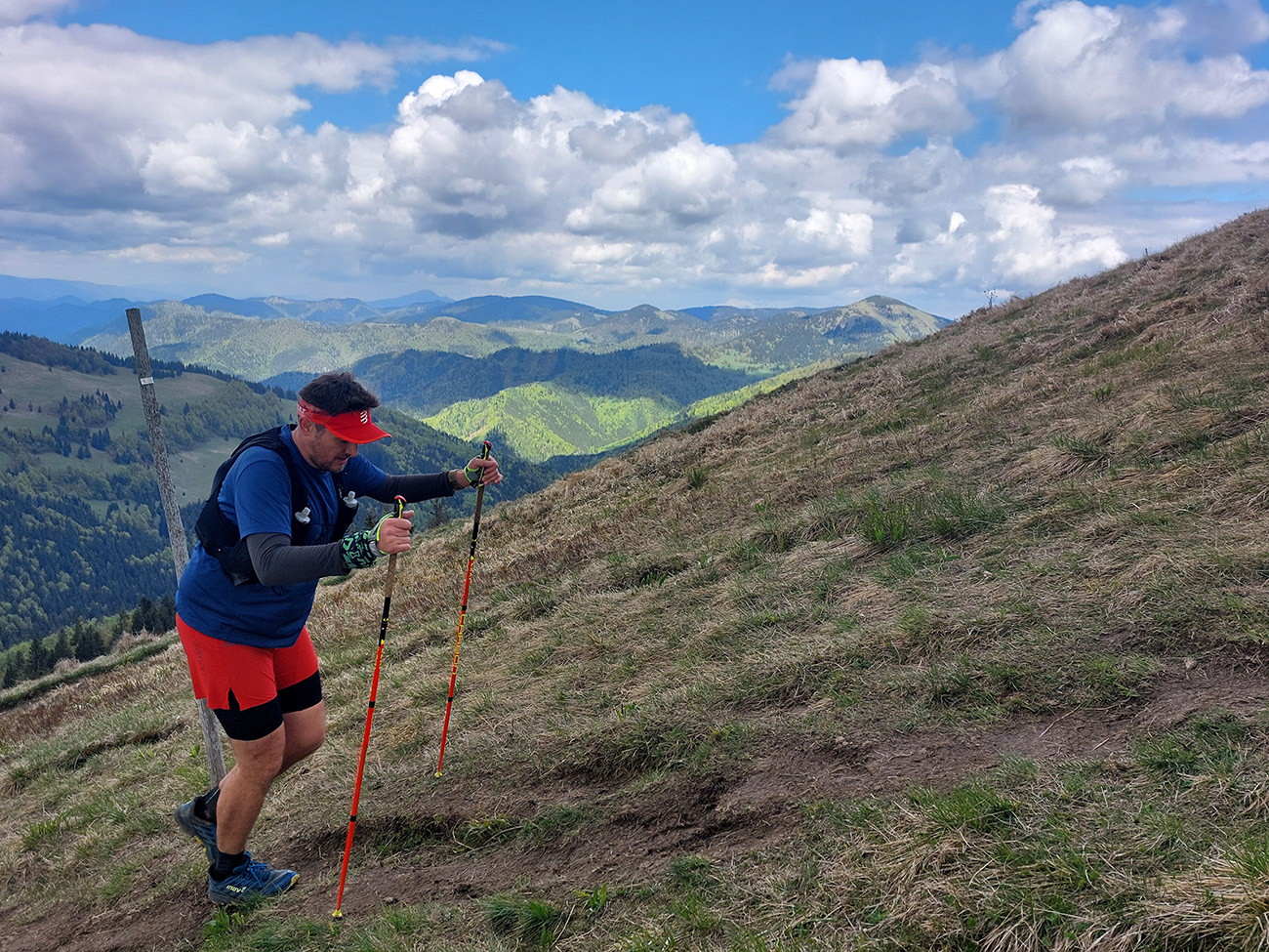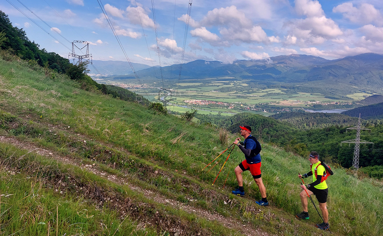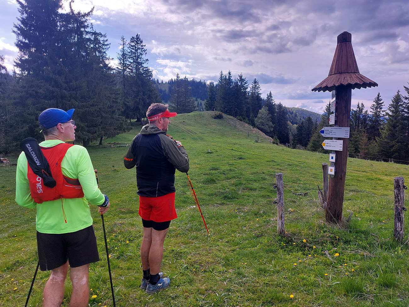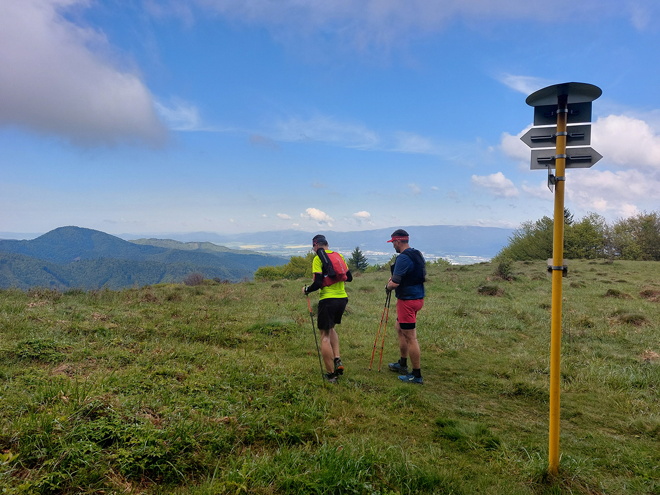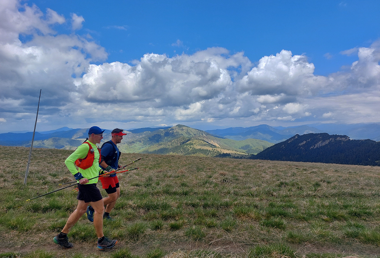 Hore slniečko, fajnúčko, pauzička - na rožky a tyčinku. Ale pohľad na hodinky nepekný: prvých 17 kilákov za štyri hodiny! Neznalý by už panikáril, my domáci vieme, že po obrátke sa to zlepší. Len či potom ešte budú sily, že? Musia byť, čelovky nemáme.
