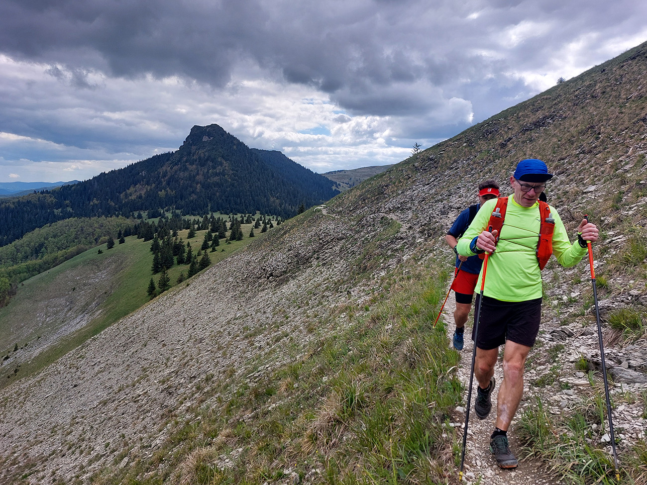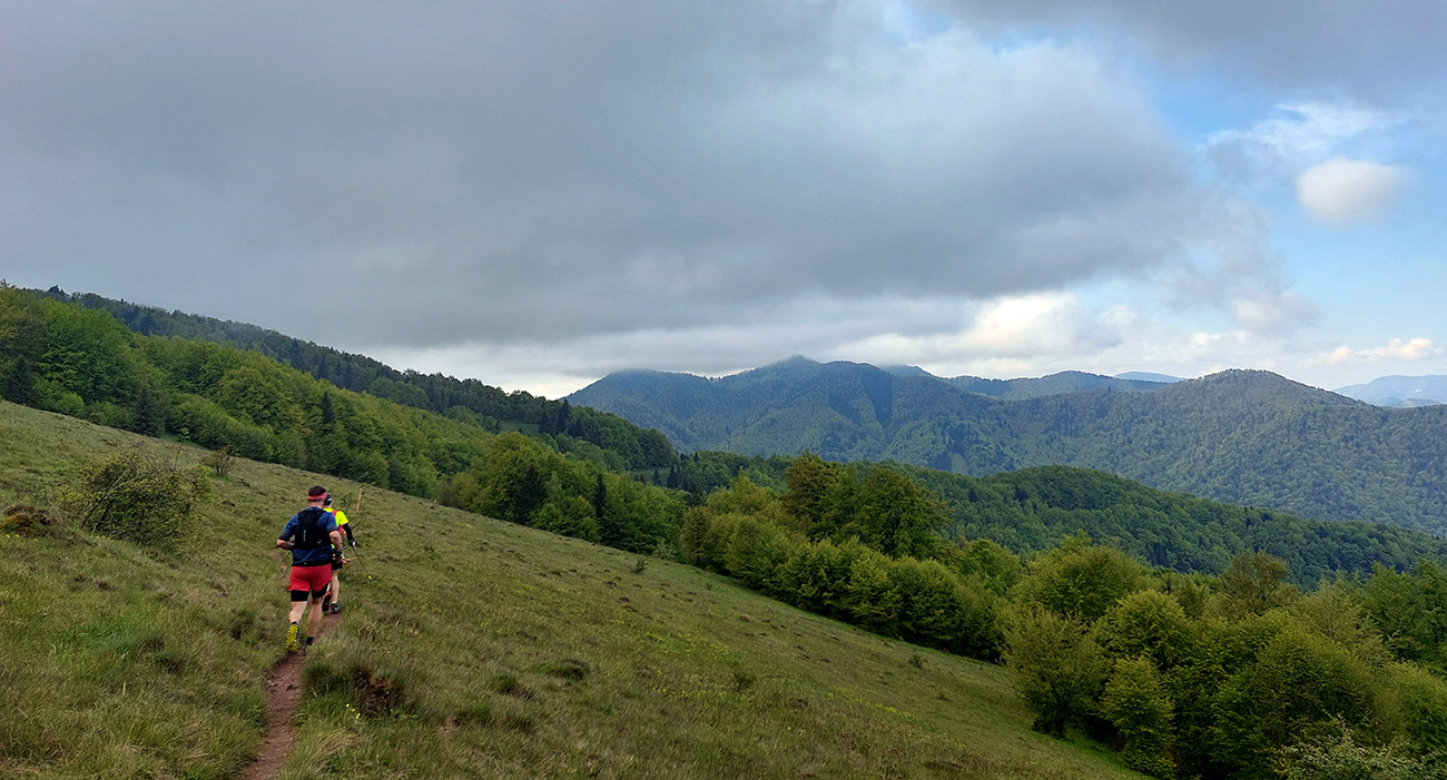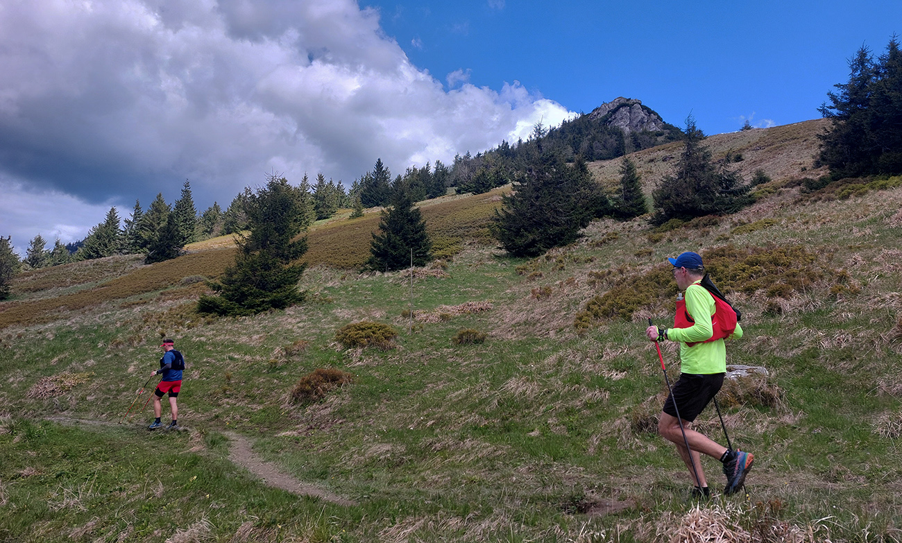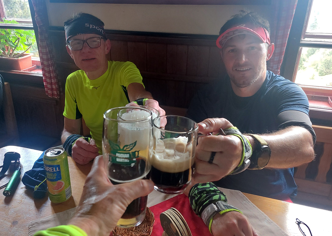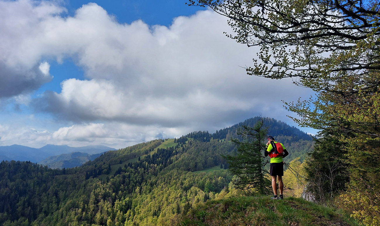 Hore slniečko, fajnúčko, pauzička - na rožky a tyčinku. Ale pohľad na hodinky nepekný: prvých 17 kilákov za štyri hodiny! Neznalý by už panikáril, my domáci vieme, že po obrátke sa to zlepší. Len či potom ešte budú sily, že? Musia byť, čelovky nemáme.