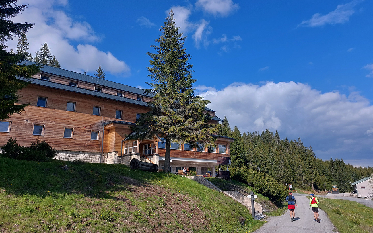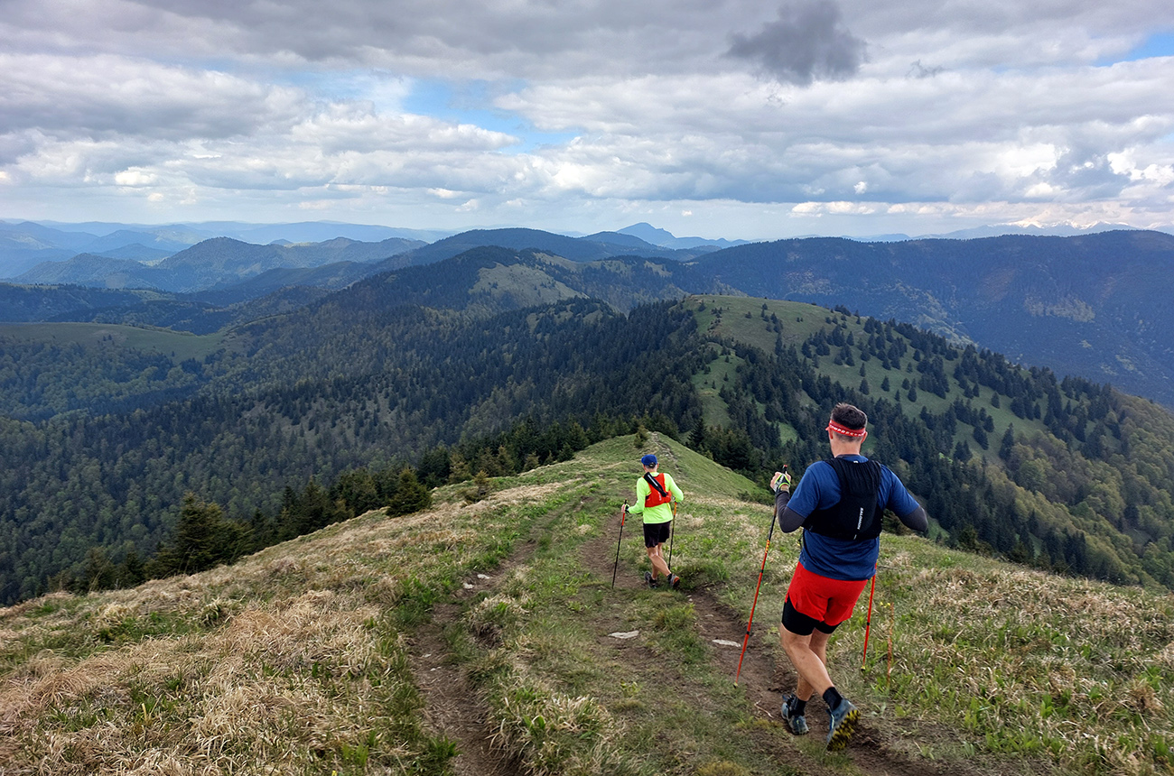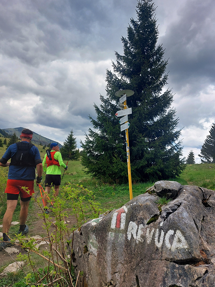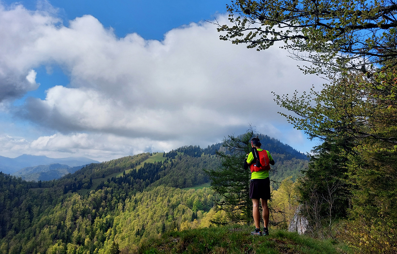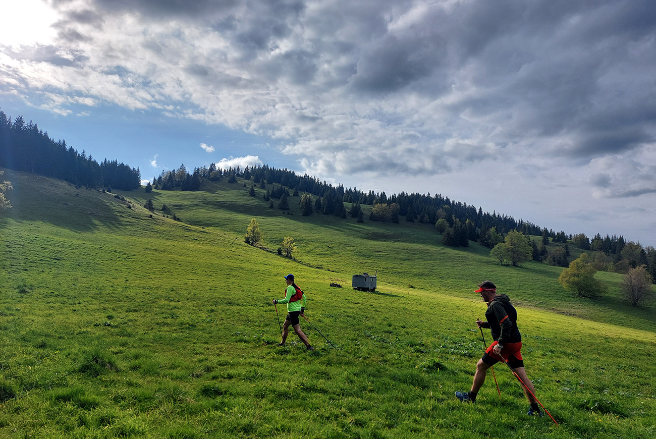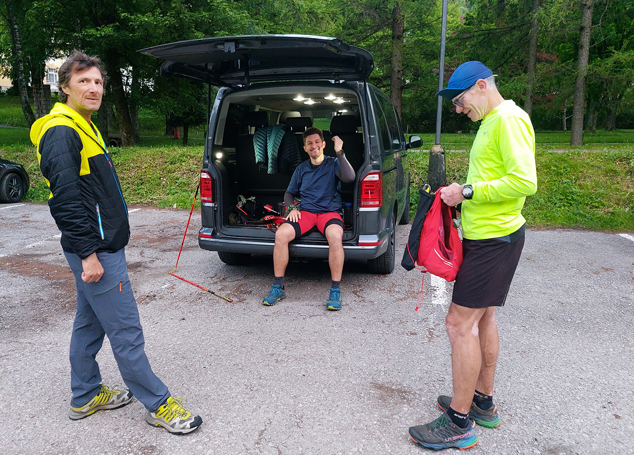 Hore slniečko, fajnúčko, pauzička - na rožky a tyčinku. Ale pohľad na hodinky nepekný: prvých 17 kilákov za štyri hodiny! Neznalý by už panikáril, my domáci vieme, že po obrátke sa to zlepší. Len či potom ešte budú sily, že? Musia byť, čelovky nemáme.