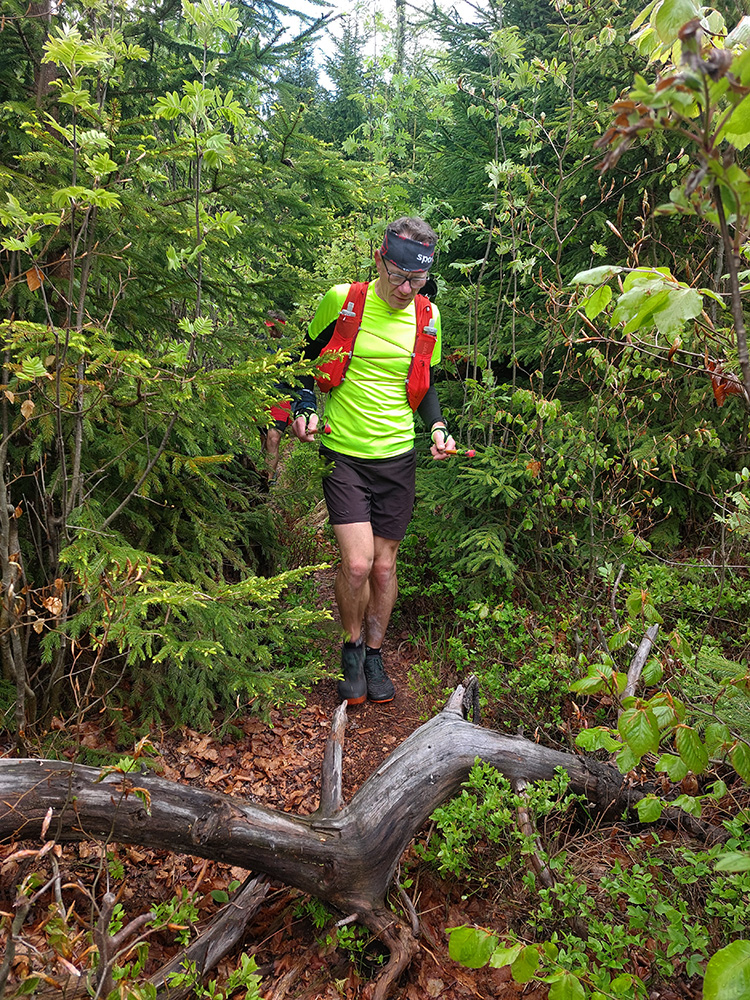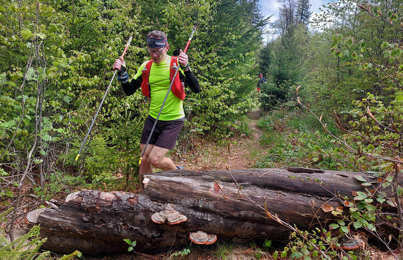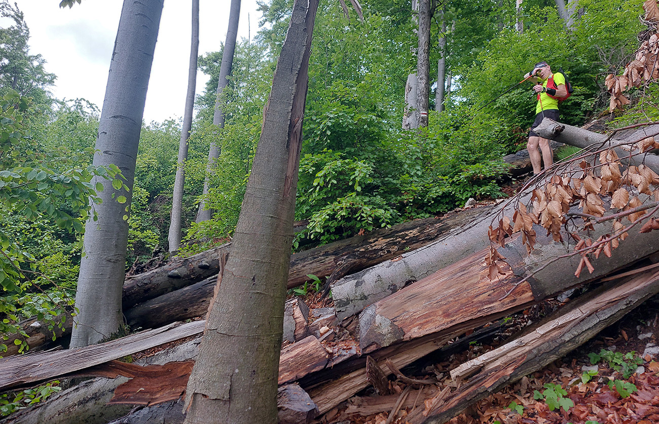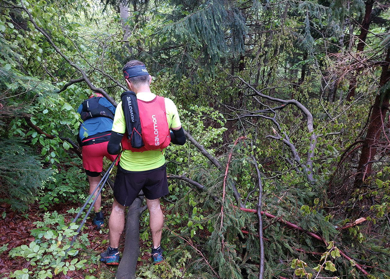 Úvod cez Korbeľku a jej spartanskú trať až ku krížu na Kope je ideál na zahriatie, cez prekážky a do strminy sme valili ešte plní síl, aj slimáka sme predbehli, to nám dvihlo egá. Hore príjemne chladno a pohľady na posledné frontové mraky, posúvajúce sa na juh. V diaľke na severe už presvitala modrá. Blatká na zostupe do Ľubochnianskeho sedla už boli po daždi tak akurát oschnuté – ani sa nelepili, ani neprášili. Len pilčíci sa na pár miestach aj na stromoch so značkami vyzúrili, tak vďaka. A popredierali sme sa cez prvú „autoumyváreň“. Našťastie len polosuchý program.