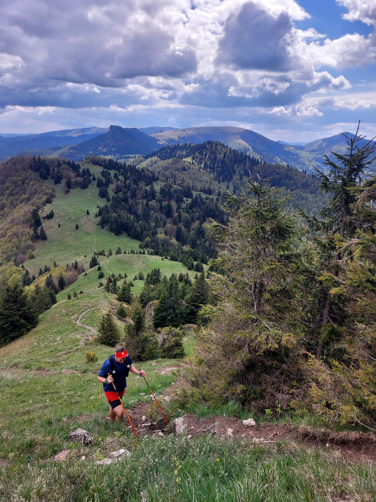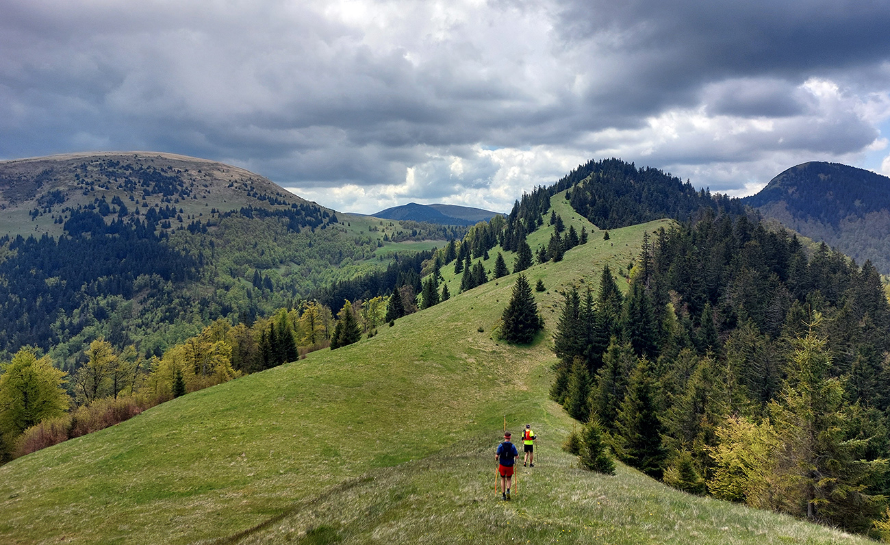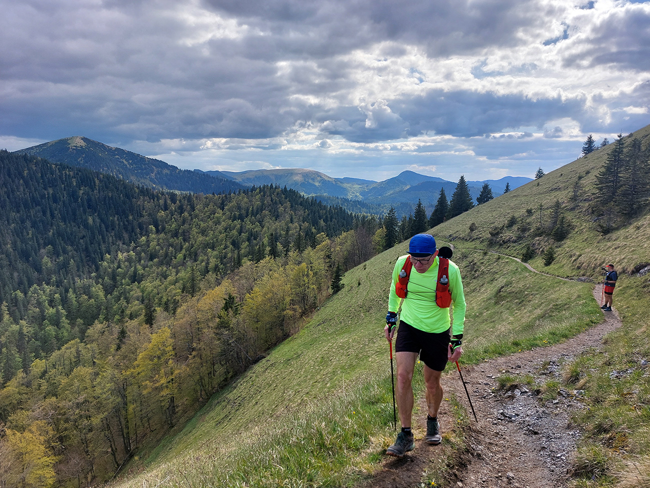 Pekne po vlastných, po veľkofatranských hrebeňoch, obkolesujúcich najdlhšiu slovenskú dolinu – tento nápad som nosil v hlave dlho, ale furt nebol čas alebo príležitosť. Lebo parametre tejto „prechádzky“ (65 km / 4500 v. m.) našepkávajú, že sa na ňu nedá len tak vybehnúť z domu. Teraz koncom mája ale všetko klaplo a dokonca sme sa nazbierali tri kusy. A aj keď pôvodný zámer bol ísť elegantne od vlaku ku vlaku v Ľubochni, ten kus, čo býva najďalej a aj ďaleko od stanice, pozbieral zvyšné dva kusy cestou do auta a bolo to komfortnejšie. Takže sme zaparkovali pred šiestou rannou pri kúpeľnom parku a keď sa šofér ešte dodatočne rozklusal asi 500 m (v aute zabudnutý telefón), začali sme plniť plán: Kopa – Kľak – Chata pod Borišovom – Ploská – Rakytov – zotavovňa Smrekovica – Magura – Kútnikov kopec. Výživnučké, často nebehateľné nie len vďaka sklonu, ale aj prekážkam. Zato však krásne, typické fatranské medveďovo, najmä na začiatku a na konci. A počasie ideálne, po fronte chladno, poloslnečno, s jemným severáčikom, ktorý neotravoval, dokonca ani na Ploskej. A to už je čo povedať! Takže takto to vyzeralo, gpx je hore: