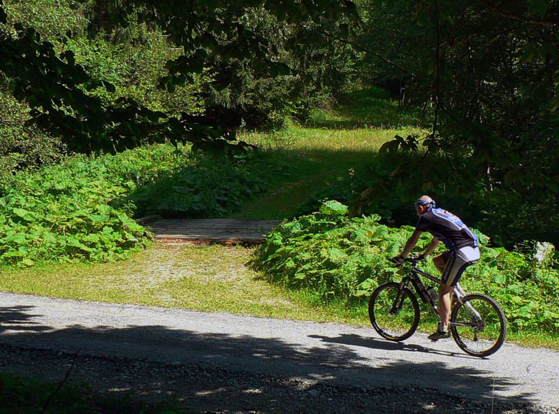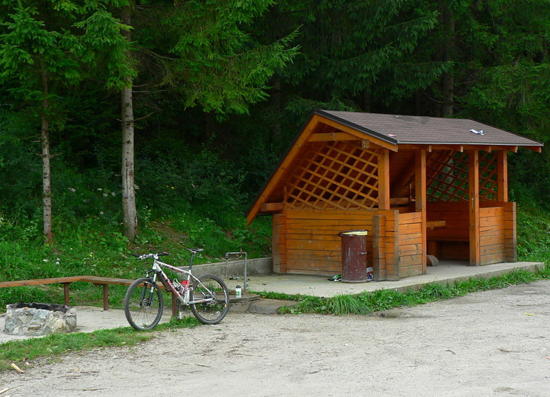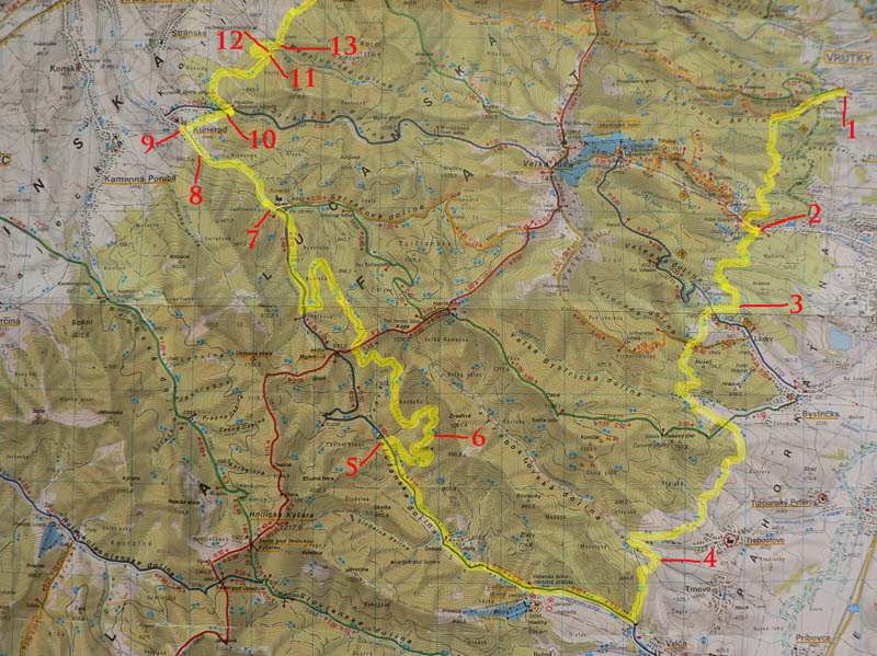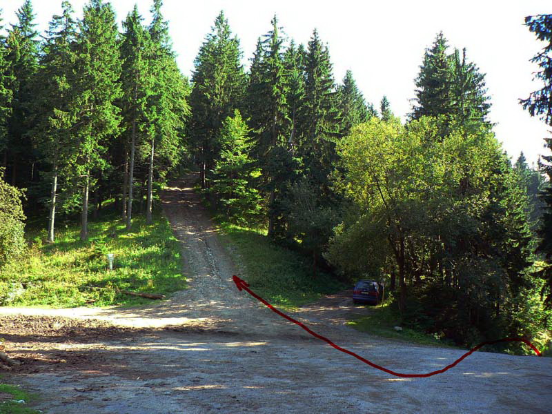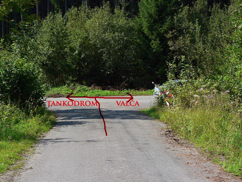 Začiatok okruhu je vhodný napríklad pri autokempingu nad Vrútkami, lebo tu to celé aj skončí po záverečnom zjazde zo sedla Javorina. Na začiatok ale treba kemping obísť z juhu (foto 1) a minúť odbočku na Martinské Hole. Nad poslednými chatami sa cesta stáča doľava cez potok a po necelých 4km končí na Stráňach asi 200m nad konečnou MHD. Pri tej je ohradený areál urbáru - zvážnica cezeň (2) je jedinou možnosťou, ako sa odtiaľto dostať ďalej nad Bystričku. Brány na oboch koncoch areálu sú zväčša otvorené a urbárnici problémy nerobia. Cesta nič moc, na začiatku fajne strmá, rozbitá a v celej dĺžke poznačená ťažbou dreva. Po 3km ústi na starú asfaltku (ideme doľava) a o chvíľu na širokááánsku vojenskú betónku (3). Odtiaľto je do ústia Valčianskej doliny pohodlných 12km, v druhej polovici sú aj nejaké výhľady do kotliny. Kúsok za otočkou na konci betónky treba z cesty vydupať krátko a strmo po lúke (4) a lesnou cestou sa spustiť do ústia doliny.