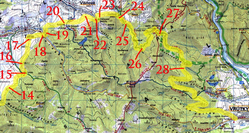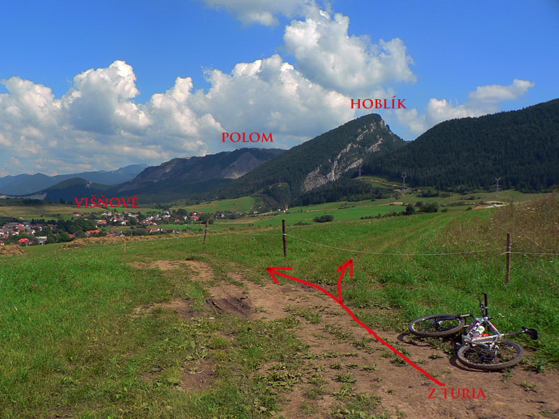 Znova známy postup: krížom cez cestu (vedie ňou zelená značka) a hore do protiľahlého svahu (15). Po krátkom stupáku dlhý zjazd do Turia po lúkach, krásnym singlíkom (16) a lúčnou cestou. Pred dedinou je nenápadná odbočka k lomu (17). Odtiaľ je už na dohľad horný koniec dediny (18), v ulici vedľa konečnej autobusu sa dá ľahko nájsť malý mostík (19). Na ceste pri ňom sú šípky – opačným smerom sa tu jazdí stráňavský maratón. Za potokom je jedno z mála miest, kde treba tlačiť – chodník stúpa lesom v traverze, od bajkov je riadne zodratý a korene sú klzké. Ale o chvíľu vybehne na lúky a z nich už vidieť horný koniec Višňového a skalnatý hrb Hoblíka (20).
