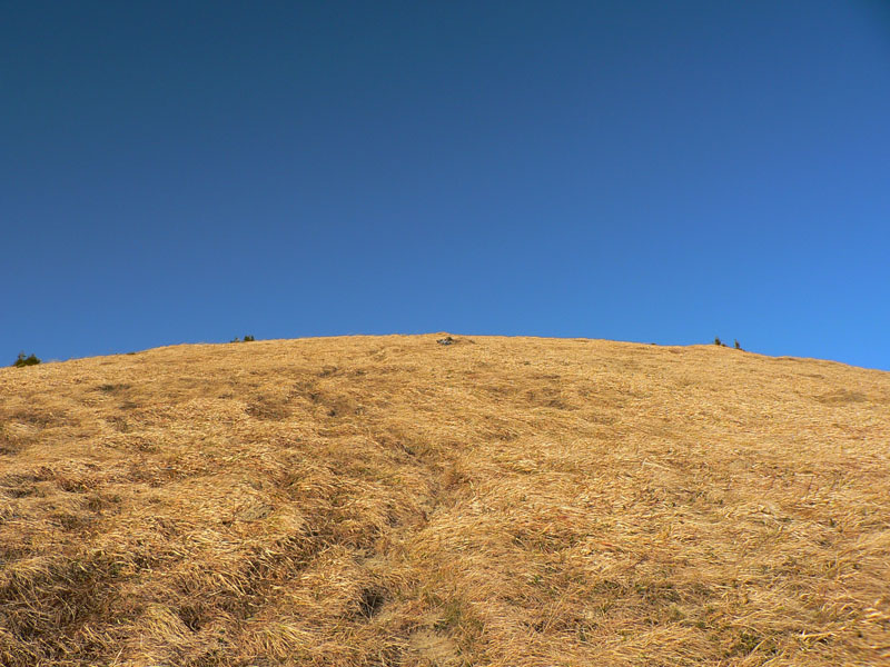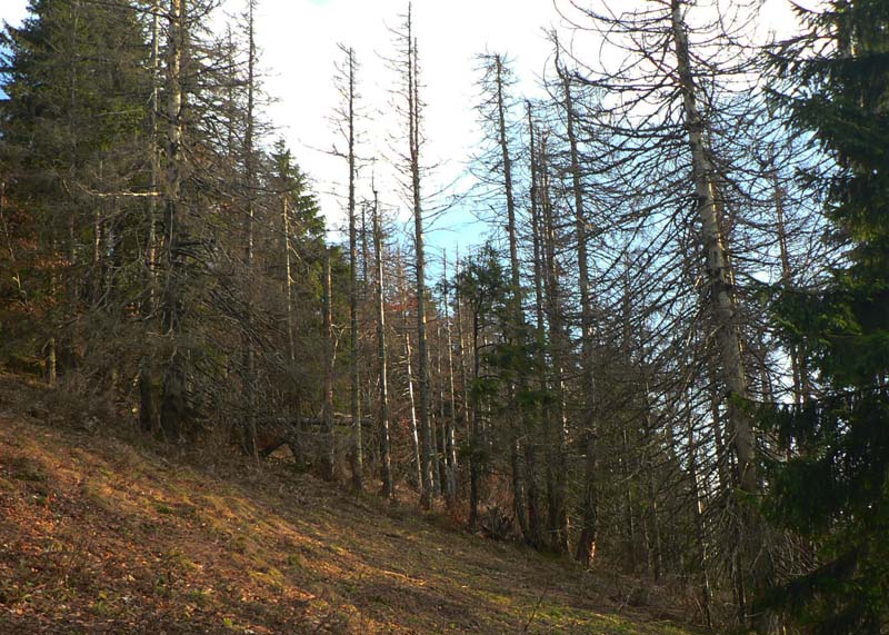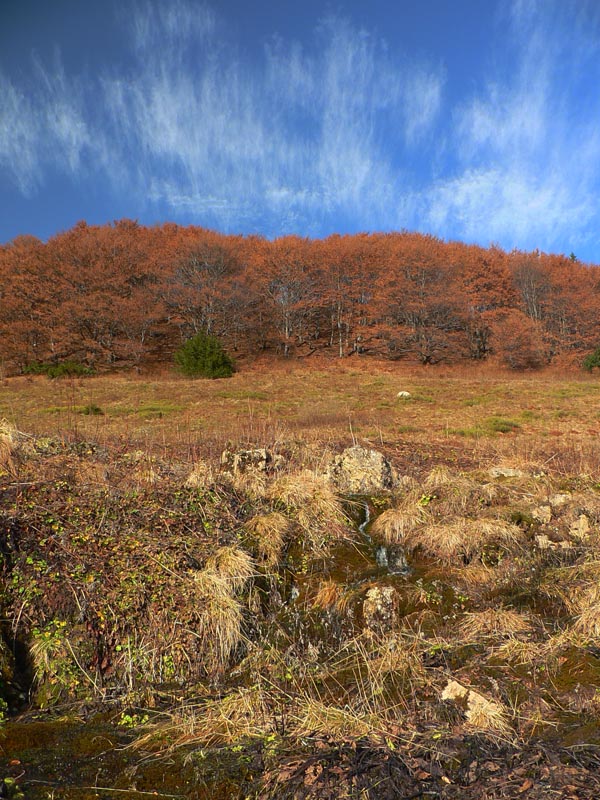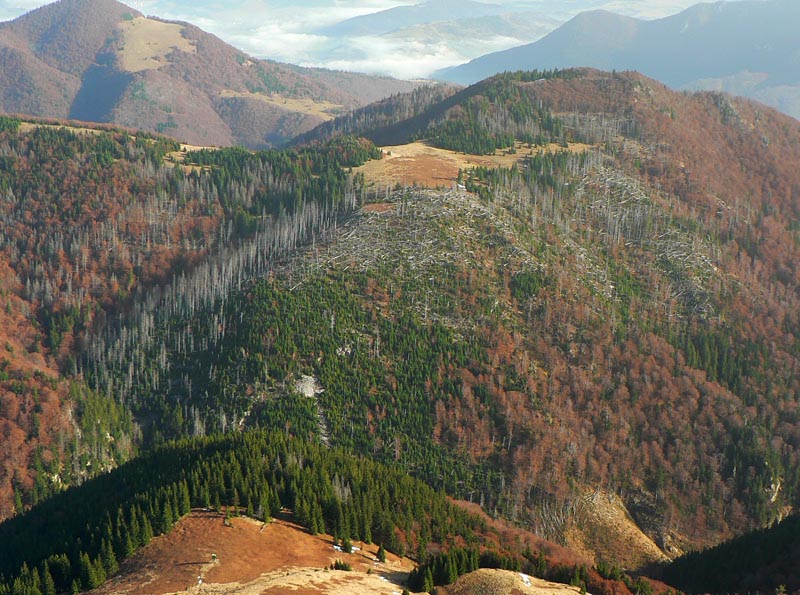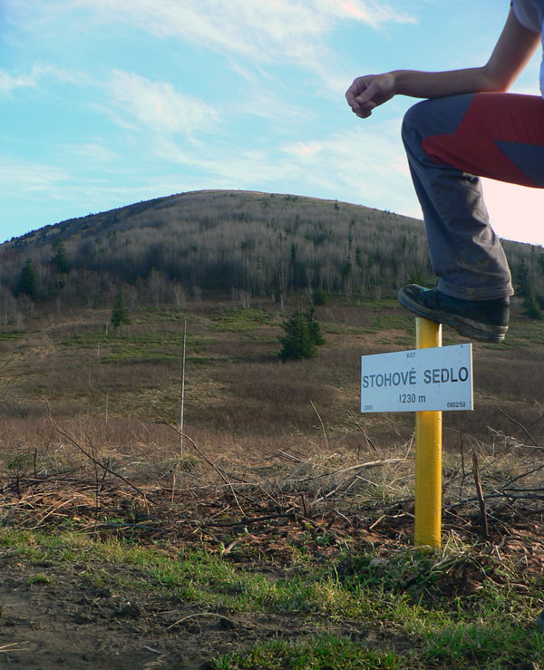 Koniec novembra 2009 bol na horách nezvyčajne teplý, zato v doline ako v práčovni. Takže to chcelo čím rýchlejšie a čím skôr na nejaký vyšší kopec. Zvolili sme východnú časť hrebeňa krivánskej Malej Fatry medzi Chlebom a Stohom, kam sa dá relatívne rýchlo „vyplaziť“ od Šútovského vodopádu. Od zastávky v Šútove – Rieke je to k vodopádu pohodlná hodinka aj niečo (podrobnejší popis je v článku o vodopáde). Odtiaľ na Mojžišove pramene riadne strmým stúpaním bučinou tiež asi hodinu a ďalších asi 30 minút na vrchol stúpania, na začiatok pohodlného traverzu popod hlavný hrebeň. Časy udávam preto, lebo oproti mape sú o dosť kratšie, pritom sme išli pomaličky, pohodovo. Slnko začalo prerážať hmlu už dolu v doline, nad lesom bol ale úplne iný svet. Rozdiel v teplote aspoň 10 stupňov a na hrebeni takmer bezvetrie. Bez problémov na tričko a kraťasy.