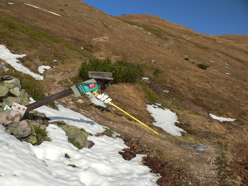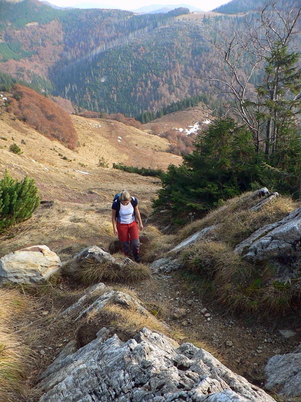 V úvodnom stúpaní od vodopádu cez les a Mojžišove pramene je len pár oddychových úsekov, ale traverz popod hrebeň smerom na chatu pod Chlebom je pohodový. Len na niektorých miestach je dosť poničený lavínami a zosuvmi. To isté platí aj o žltej odbočke, ktorá z neho vedie na hrebeň (do sedla Za Hromovým). Tu už trávnatý svah veľmi trpí eróziou, chcelo by to presmerovať alebo spevniť chodník. Zo sedla Za Hromovým do Stohového sedla je to ďalšia asi hodina a pol prevažne z kopca, s krásnymi výhľadmi do Vrátnej aj do Turca. V tomto počasí tu bolo samozrejme plno ľudí. My sme nechápavo pozerali na obrovské holoruby priamo pod Veľkým Rozsutcom, hnusný zásek novej cesty na Grúni a nejaký nový hotel pod Sokolím, ktorý svojou výraznou žltou farbou ohromne „ladil“ s okolím. Biznis forever! Na druhej strane hrebeňa (pod Žobrákom) sa zas v lese vyzúrili lavíny, vietor aj lykožrút. Každý nech si domyslí, čo do prírody národného parku patrí viac.Stúpanie na Stoh bolo tradične nekonečné a šmykľavé, odmenou za námahu bol „pózujúci“ Rozsutec. Klesanie do Kraľovian je najprv po príjemnom chodníku nad hranicou lesa s peknými výhľadmi hlavne na protiľahlé svahy nad záverom Šútovskej doliny. Nižšie v lese už značka vedie po zvážnici, ktorá je hlavne v spodnej časti riadne povymieľaná. Dobrá ústupová trasa z hrebeňa, ale opačným smerom odporúčam len masochistom.