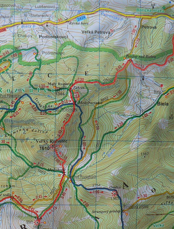 Po zostupe sa napájame na červenú značku, ktorá by nás mala po necelej hodine priviesť do sedla Príslop nad Bielou. Trvá to ale dlhšie, hriech by bolo obchádzať početné skalné ostrohy s vyhliadkami do doliny Bielej. Na lúkach sa otvárajú pohľady aj na sever, do Zázrivej. Posledný úsek zostupu do sedla je nepríjemne dlhý a strmý, zato ho spestrujú početné staré buky, poskrúcané do rôznych patvarov. V sedle sa zo značenej trasy odpájame a zostupujeme po lúkach cez najvyššie položené usadlosti Bielej do centra dediny. Dokončujeme okruh a z porovnania charakteru jeho začiatku a konca je jasné, že sme zvolili správny, teda príjemnejší smer.