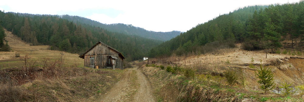 Cestou dolu sa už nespúšťam úplne do sedla, lebo mierim na ďalšie charizmatické miesto, len kúsok na sever po hrebeni. Na dnes definitívne opúšťam značkovaný chodník. Pomedzi vápencové bralá s malými jaskynkami sa štverám na Hrdoš, krasovú plošinku otvorenú na západ k Šípu. Dôvodom je samozrejme výhľad, ale ani nie tak na Šíp, ako na ďalšiu časť cesty vo svahu naproti. Dúfam totiž, že od búdy (ktorú zhora vidieť) vedie na lúky neďalekého Žaškovského sedla zvážnica. Na mape síce je, ale viem aké staré sú tie mapové podklady. Tak nech aspoň poznám smer. K búde cesta jasná, zblízka vysvitá že je to bar! Fľaše síce prázdne, ale niektoré dokonca zálohované! Aj prespať (na laviciach) by sa tu dalo, podobne ako vyššie v jednej z tých jaskyniek. Tu sa navyše človek môže z vnútra zatvoriť. Cesta ďalej? Poriadne rozrytá, ale neomylne smeruje kam potrebujem.