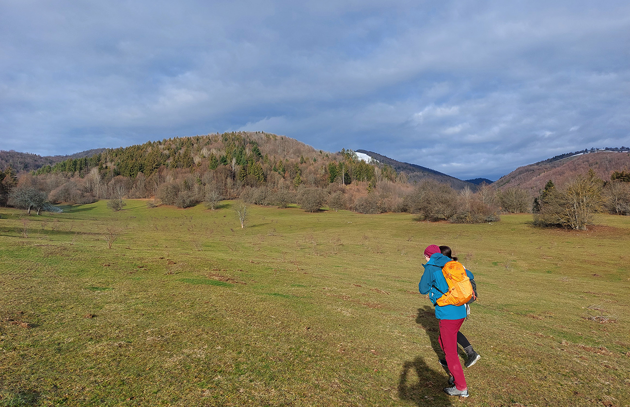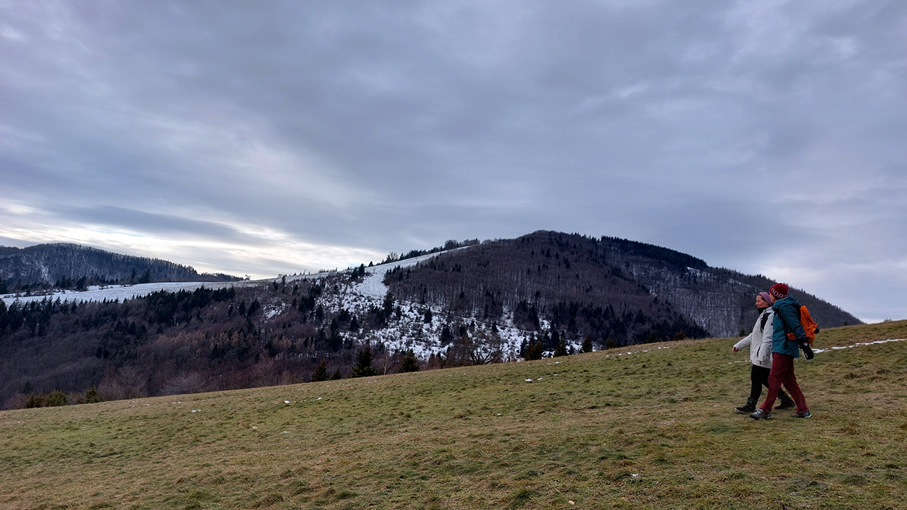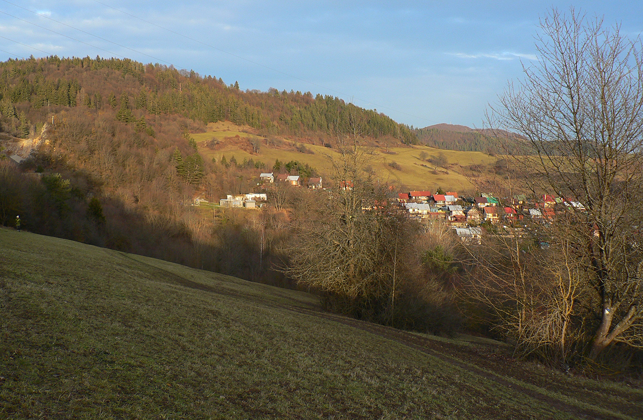 Z lúk sme sa ponorili do lesa a z lesa sme sa vynorili pri kameňolome. Čiže záver menej pekný pre oči, lebo samozrejme do kríkov popri ceste miestni vypatlanci vyvážajú odpad. A ešte sranda obrovská nastala po prechode záhradkárskou osadou, keď sme sa hore lúkou potrebovali dostať nazad k autu – miestne kosačky aj koncom roka tade chodia do práce, takže blatové závažia sme mali na topánkach už po pár metroch. Ale inak super bolo, fajná prechádzka je to, asi na päť hodín, dobrá aj na krátke zimné dni.