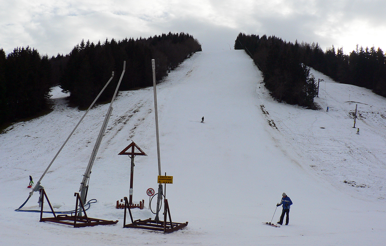 Dole do centra strediska je na výber – pohodlná cesta (ak nie je pod ľadom, ako sme mali my), v dolnej časti aj s priehľadom pomedzi konáre na Španiu dolinu. Alebo (takto v zime) trebárs na sáčku priamo dole po zjazdovke.