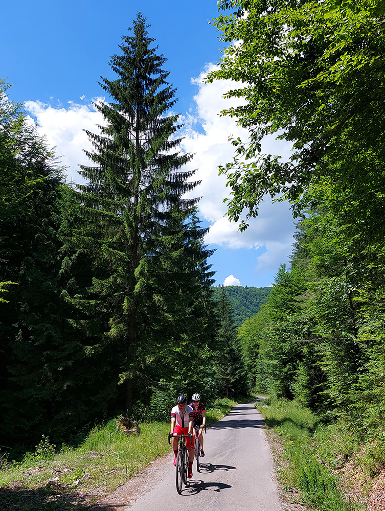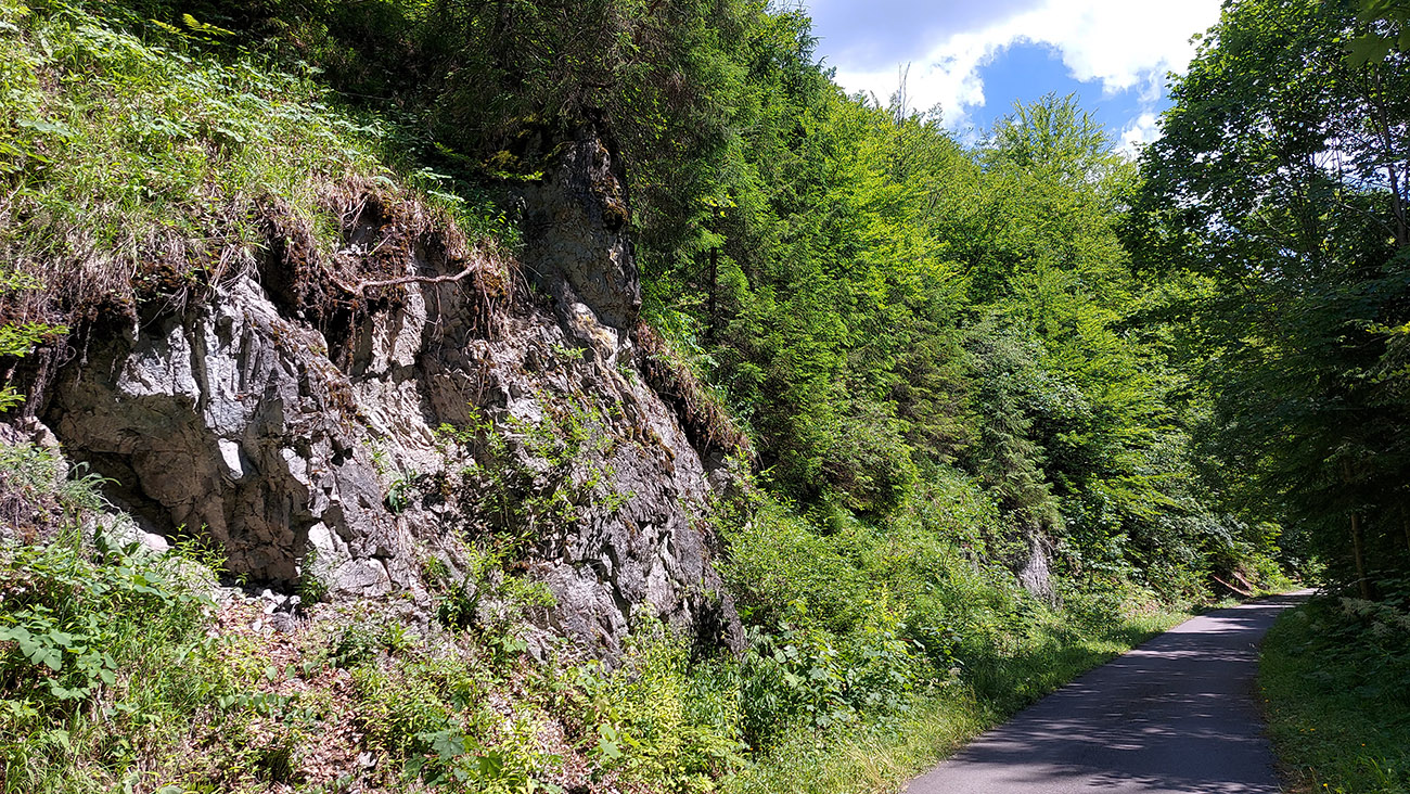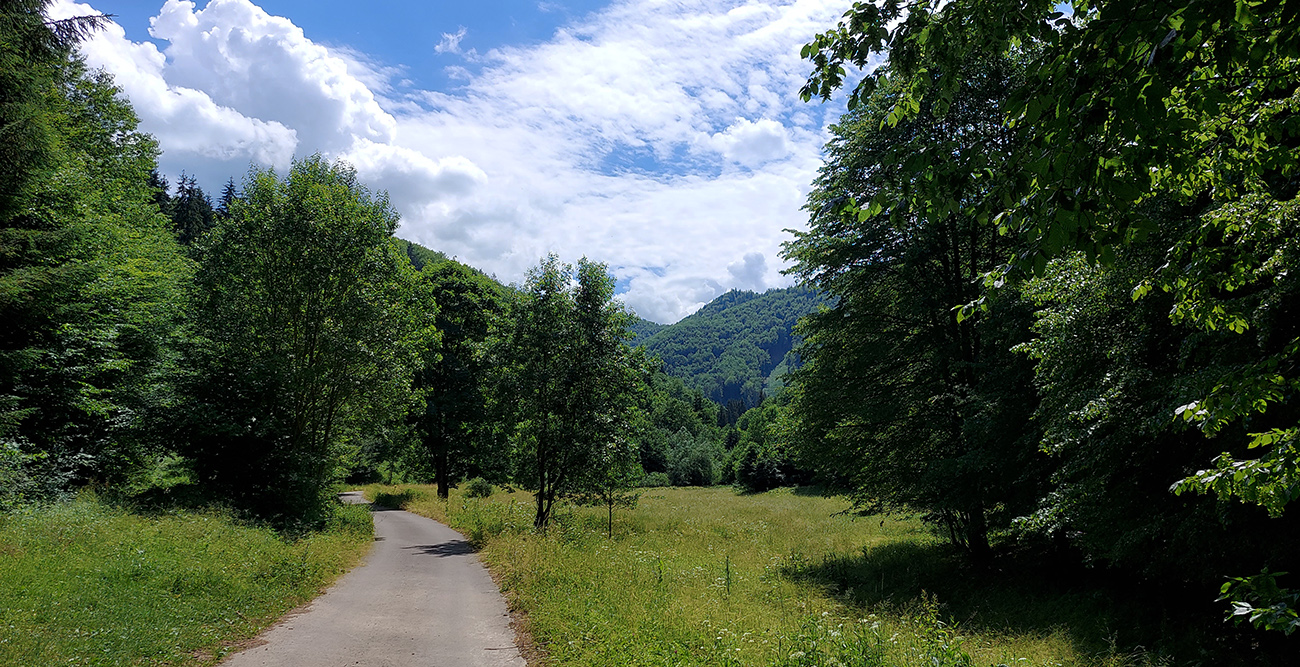 Od chaty potom už začína dolina. Keď je širšia, sklon je mierny, keď sa zúži, pritvrdí. Z lesa vtedy vykukujú aj skalné vežičky, vedľa zurčí potok a čím vyššie, tým je nad hlavou viac tieňa. Po takých piatich kilákoch cesta preskakuje potok a po ďalších pár stovkách metrov je tu záver cyklotrasy, ale najmä asfaltu. Dá sa samozrejme pokračovať po ceste pohodlne až do sedla Príslop, ale to už chce aspoň gravel.