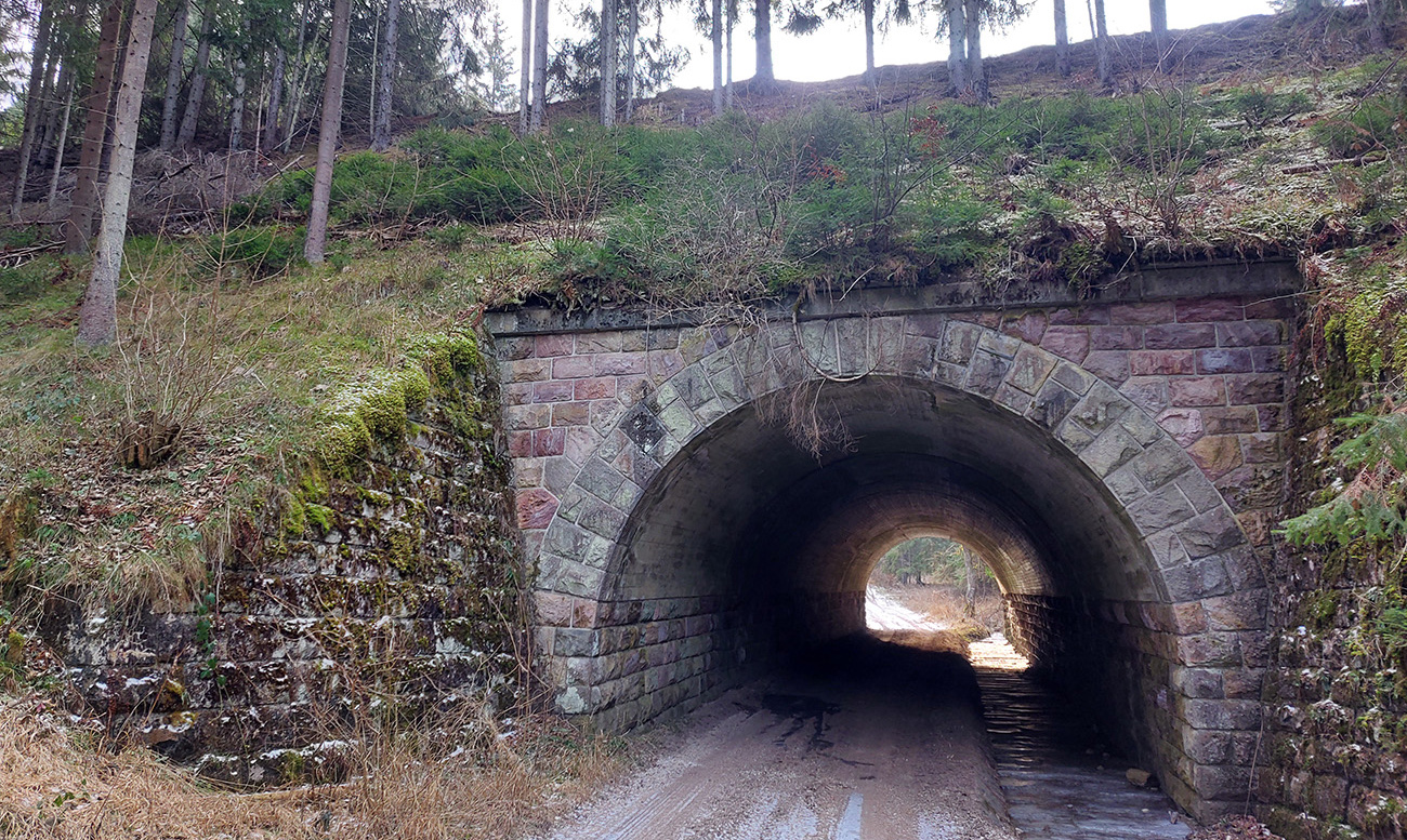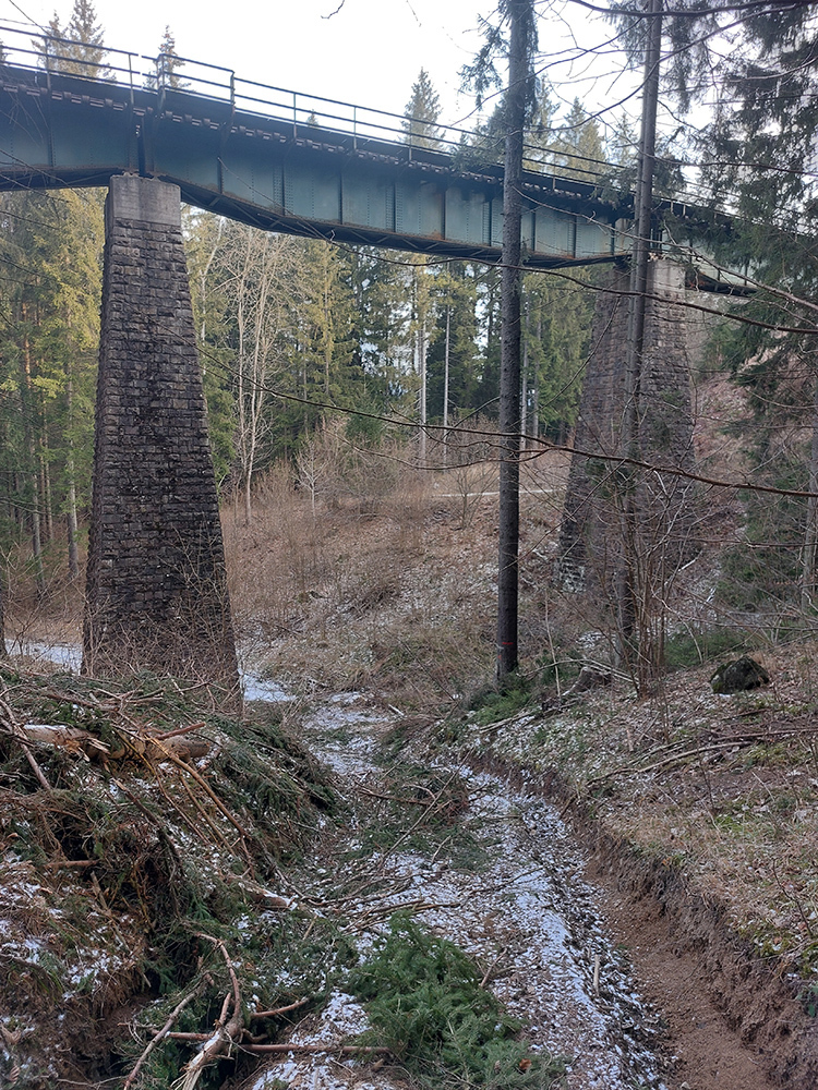 Na úvod prvý raz popod viadukt, pod ním aj cez potok a pohodové zvážnice ponad železnicu až do doliny Čiernej vody, na zelenú značku. Je tam viacero možností, dobré je to za sucha aj na mtb, len na úvod to tam teraz bolo trochu rozryté kvôli ťažbe dreva.Popod železnicu celkovo trikrát, posledný raz takto: