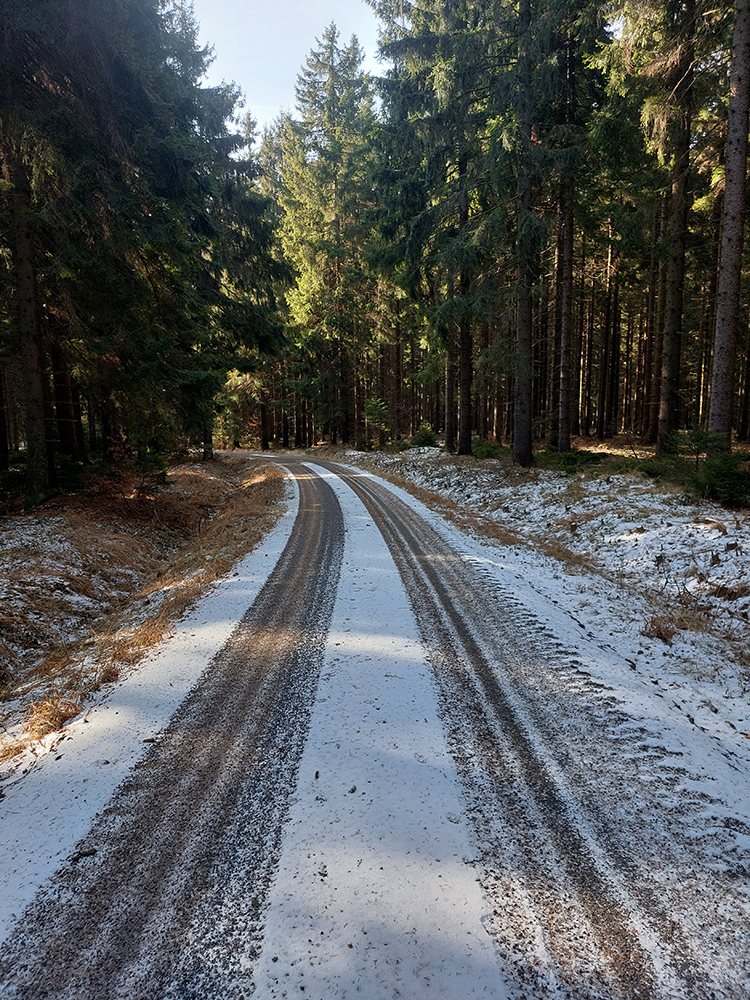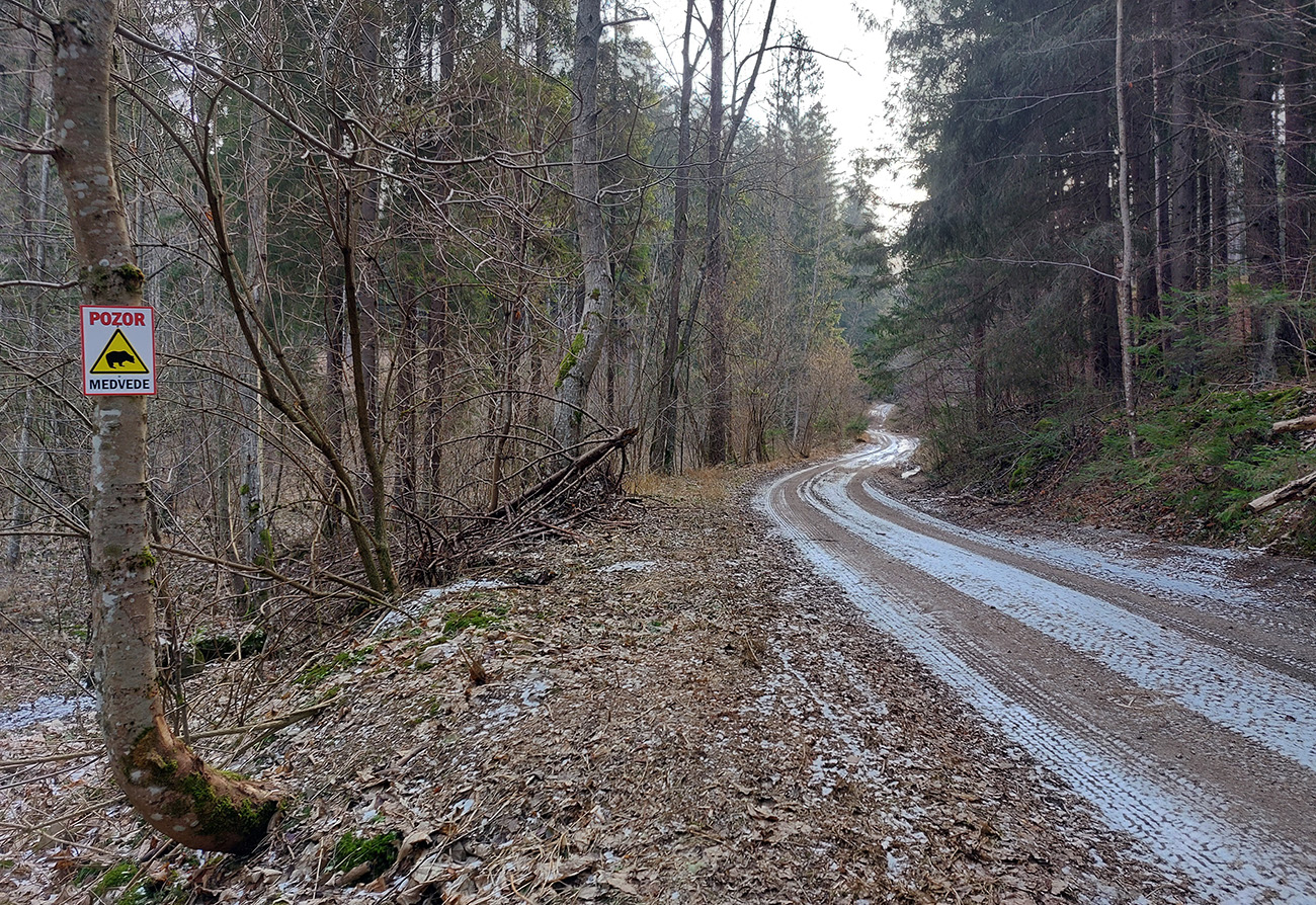 Ešte trochu prebárania bolo na aktuálne nepoužívanej ceste v obchvate bezmenného kopca nad Širokou dolinou, ale tá bude v lete skvelá pre bajk. Potom čím nižšie, tým viac šotoliny, samozrejme. A jeden či dva biedne priekuky pomedzi redšie stojace stromy – ku hrádzi vodárenskej nádrže Turček.