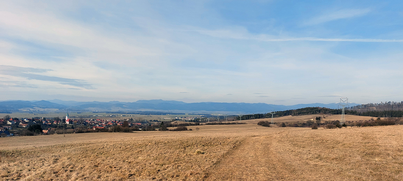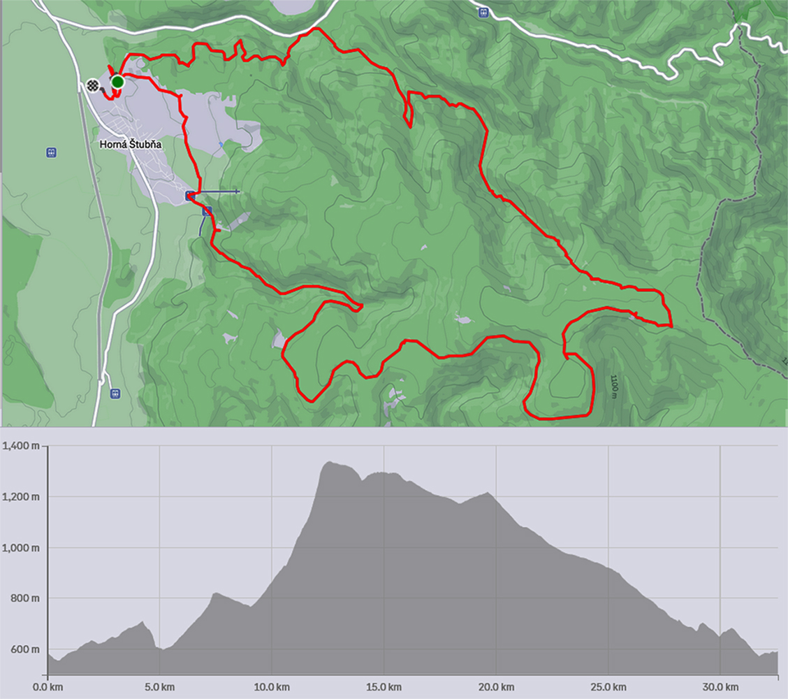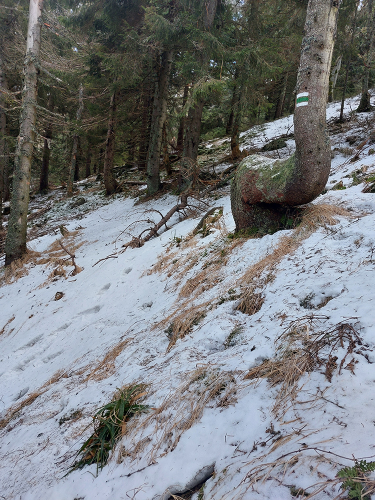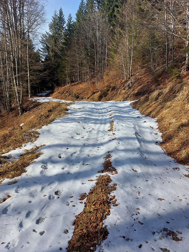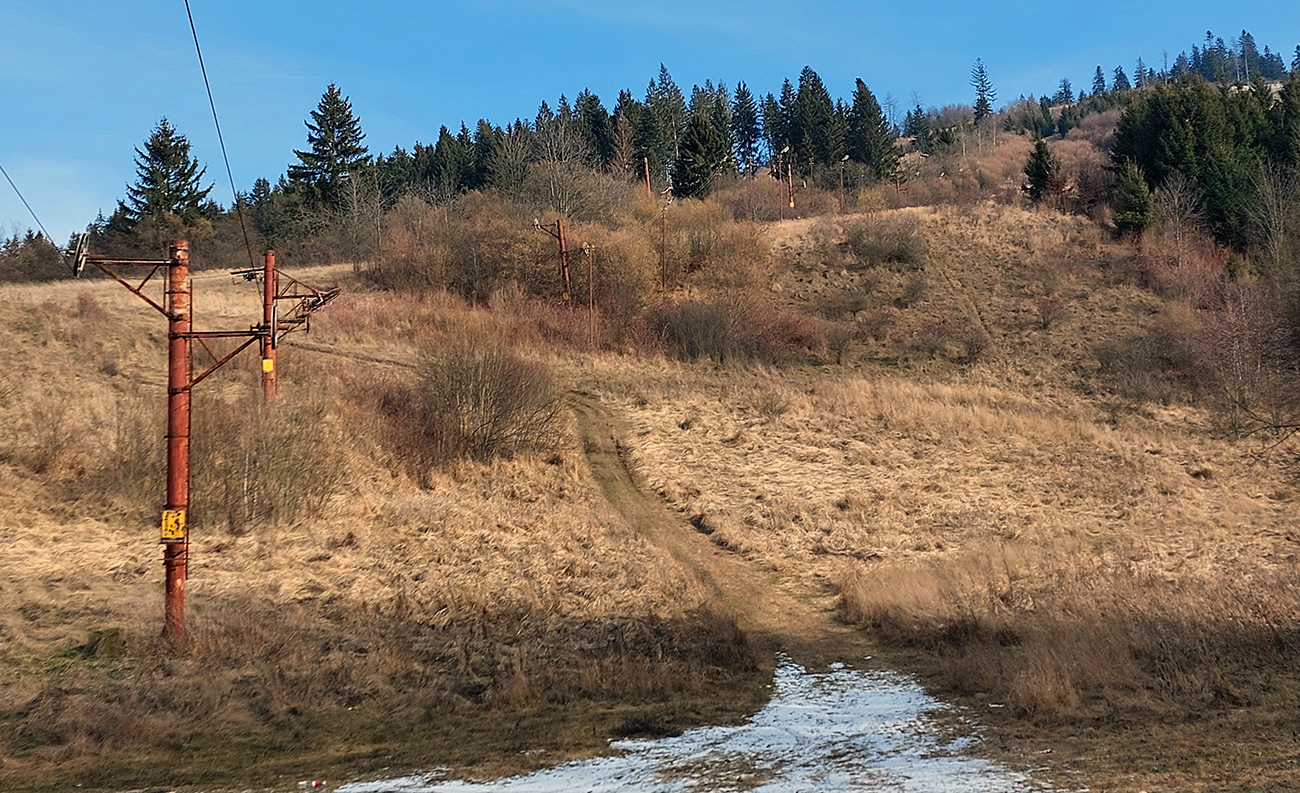Najvyšší kopec Kremnických vrchov má síce 1319 m, ale je to zalesnený chrbát bez výhľadov a všetky cesty na tú „náhornú plošinu“ vedú lesmi, z veľkej časti hospodárskymi. Len hore je rezervácia. Zároveň ako pokračoval snehovo biedny február (skôr taký koniec marca), keď sa v noci vyjasnilo a všetko to zmrzlo, nechcelo sa mi lyžami dakde po ľade hrkotať, obul som trailovky. Vyšiel z toho okruh od vlaku k vlaku, z hororovej (Hostelovej?) stanice v Hornej Štubni. Samé zvážnice, len strmý záver výstupu na Flochovú od severu (po zelenej) po lesnom chodníku. Zároveň po poriadnom klzisku. Takže skôr tréning – pohodová vyklusávačka, iba za vrcholom, na jednom neprechodenom úseku lesnej cesty sa to trochu pod nohami borilo, inak ani na to prebáranie niet nikde snehu. A zvážnicové blatá pomrznuté a lúky nad dedinou suché, ani som nemal šancu sa zaprasiť. Takže spokojnosť, takto to vyzeralo: