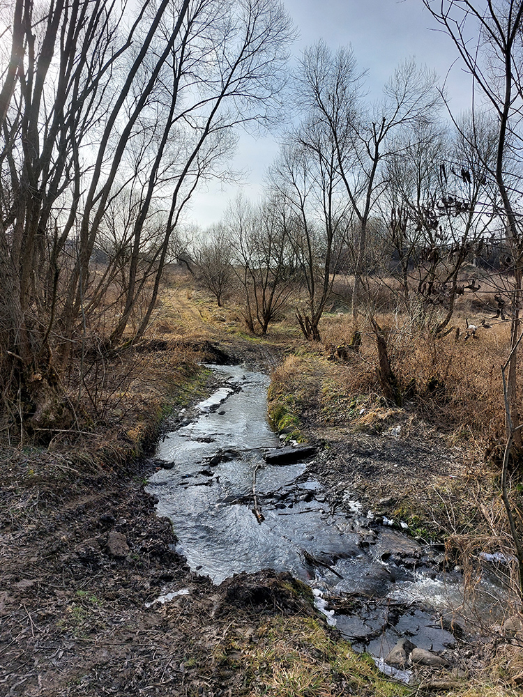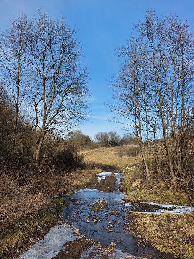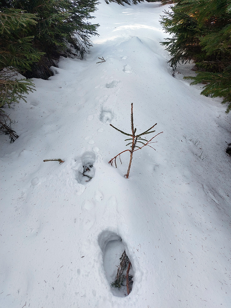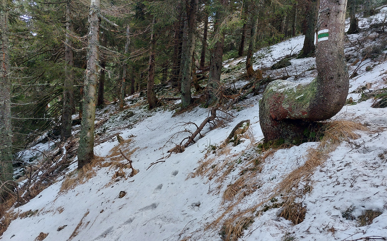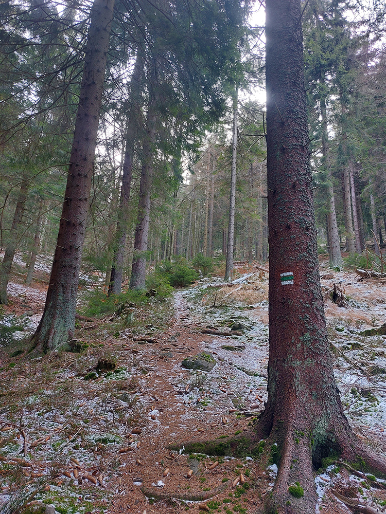 Najvyšší kopec Kremnických vrchov má síce 1319 m, ale je to zalesnený chrbát bez výhľadov a všetky cesty na tú „náhornú plošinu“ vedú lesmi, z veľkej časti hospodárskymi. Len hore je rezervácia. Zároveň ako pokračoval snehovo biedny február (skôr taký koniec marca), keď sa v noci vyjasnilo a všetko to zmrzlo, nechcelo sa mi lyžami dakde po ľade hrkotať, obul som trailovky. Vyšiel z toho okruh od vlaku k vlaku, z hororovej (Hostelovej?) stanice v Hornej Štubni. Samé zvážnice, len strmý záver výstupu na Flochovú od severu (po zelenej) po lesnom chodníku. Zároveň po poriadnom klzisku. Takže skôr tréning – pohodová vyklusávačka, iba za vrcholom, na jednom neprechodenom úseku lesnej cesty sa to trochu pod nohami borilo, inak ani na to prebáranie niet nikde snehu. A zvážnicové blatá pomrznuté a lúky nad dedinou suché, ani som nemal šancu sa zaprasiť. Takže spokojnosť, takto to vyzeralo: