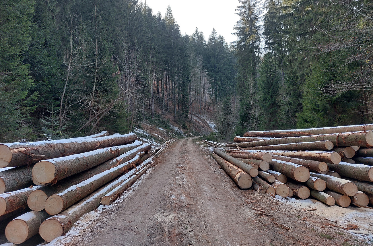 Od križovatky Široký peň už aj asfalt pod nohami a dlhéééé dupanie mierne dole až do dediny, s postupným pribúdaním ťažby a približovania dreva naokolo. Aj tam by sa to dalo možno obabrať po mäkších bočných cestách, alebo kadejako poskracovať či poobchádzať.