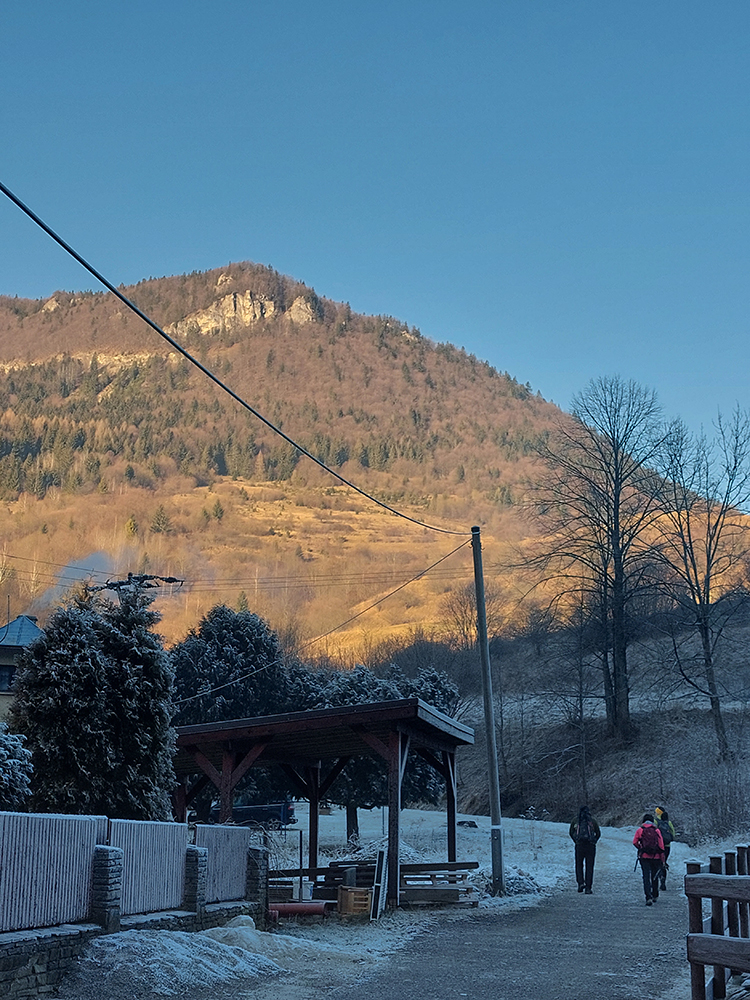 V Medziholí už len v tieni. Zužujúce sa panorámy sú preteplené len odbleskami svietiacich vrcholkov, ale ako klesáme a za hrebeňmi slnko tiež, aj tie zvyšky svetla prechádzajú do podvečernej oranžovej. Z lesa na lúky nad Bielou sa už vynárame do šera a dole dedinou okrem tmy a mrazu hustne aj atmosféra rozbiehajúcich sa predsilvestrovských osláv. Povoz trpezlivo čaká, a že načo sme sa tam hore trepali, keď sme aj tak nakoniec dole zišli :-)