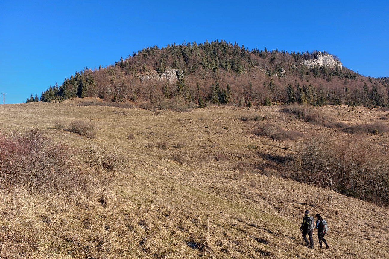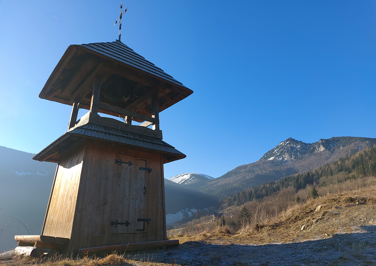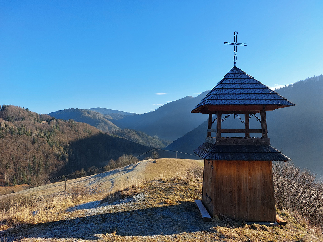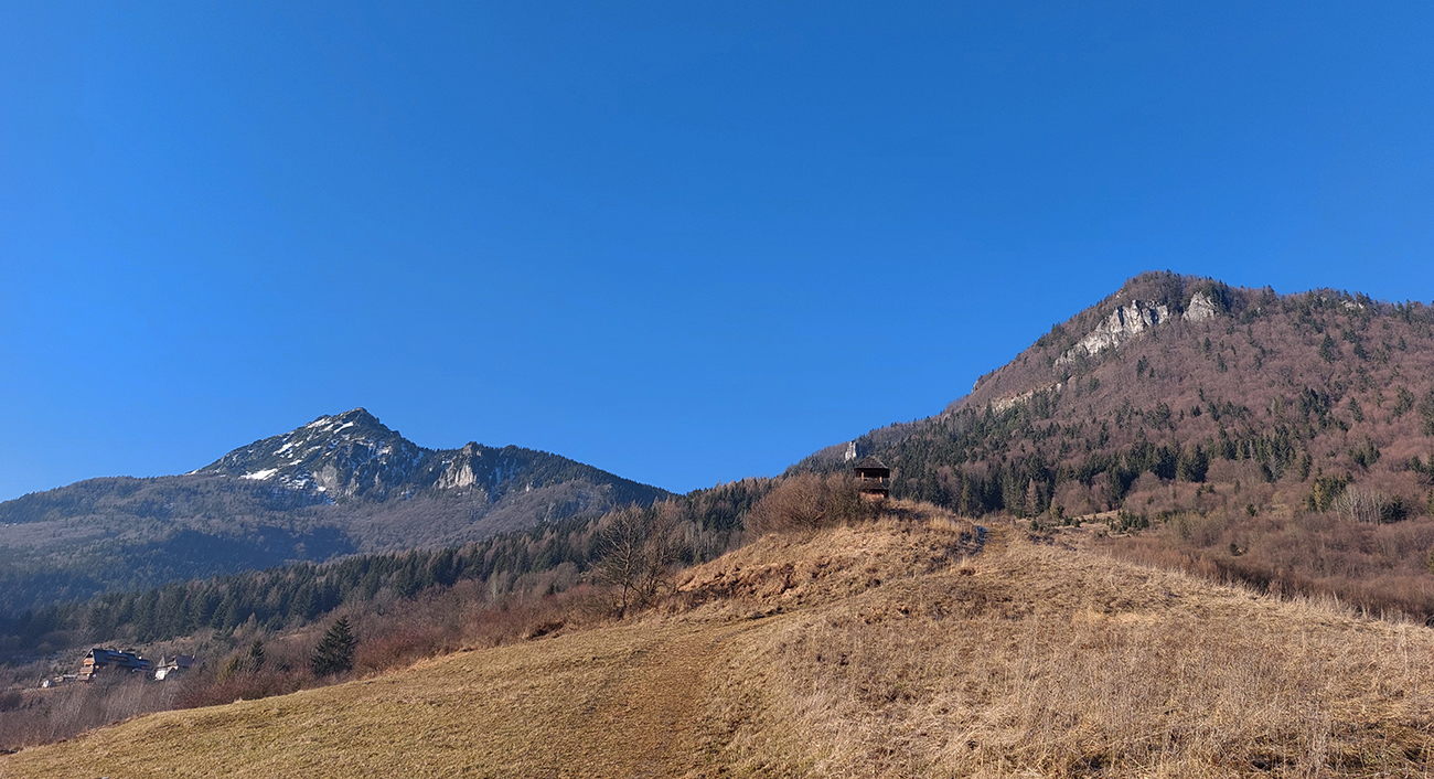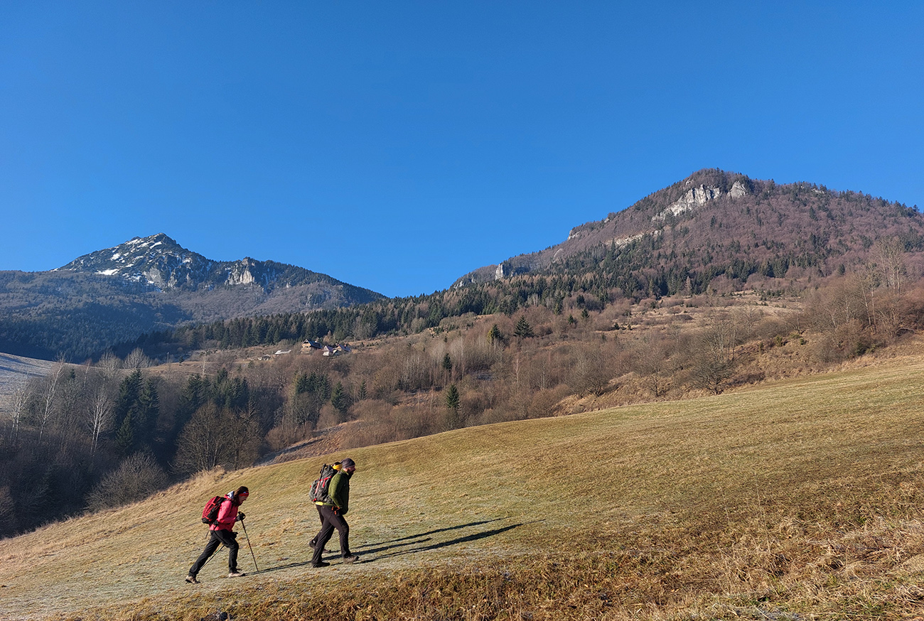 A teraz už seriózne teda... Na rozchodenie tak akurát do kopca, okolo dvoch zvoničiek nad Bielou do sedla Príslop. Po trávnatých chotárnych cestách a po ovčích prtiach, z hlbokého, mrazivého tieňa na ostré slnko. S naberaním výšky čoraz širšie panorámy: vpredu bralá pod Čapicou, vľavo Veľký Rozsutec, vpravo zalesnené dolnooravské dominanty: