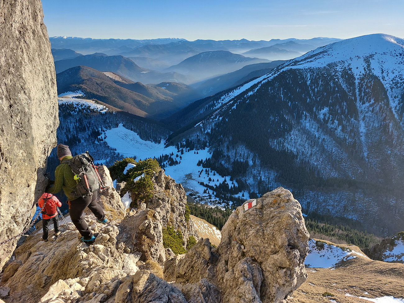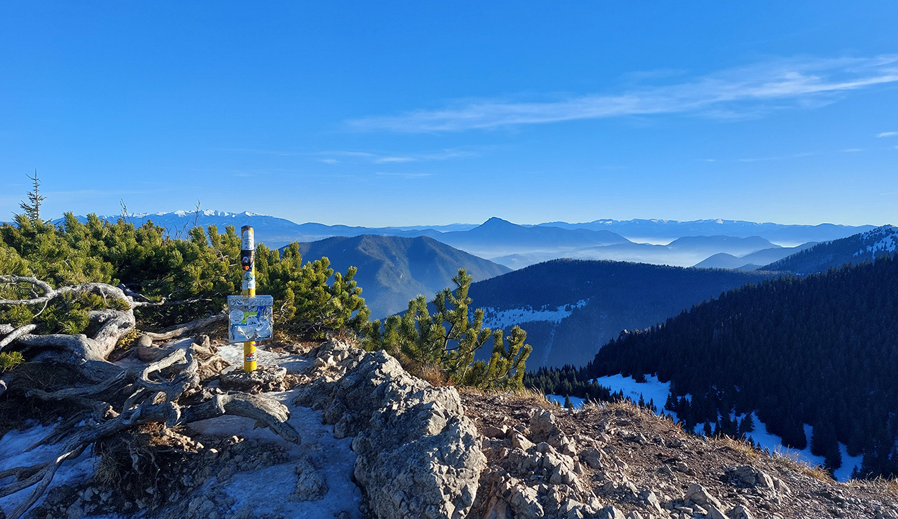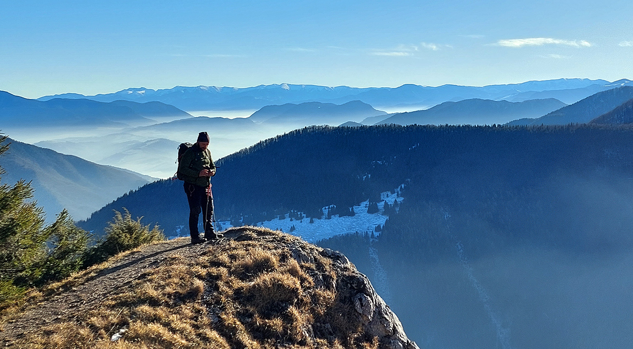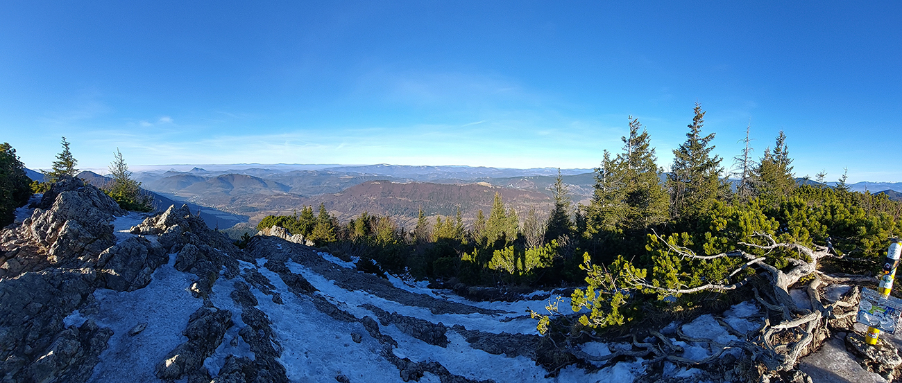 Hore prefukuje fest, ale dajú sa nájsť aj ohriate miestečká v závetrí, tak piknikujeme na predvrchole, a potom ideme už len na krátku návštevu ku smerovníku, ružici a krížu. Aj preto, lebo je tam husto. Furt tie isté panorámy, škoda hovoriť, akurát čo vidíme nové, že aj Turčianska kotlina je na dne mrazáku.